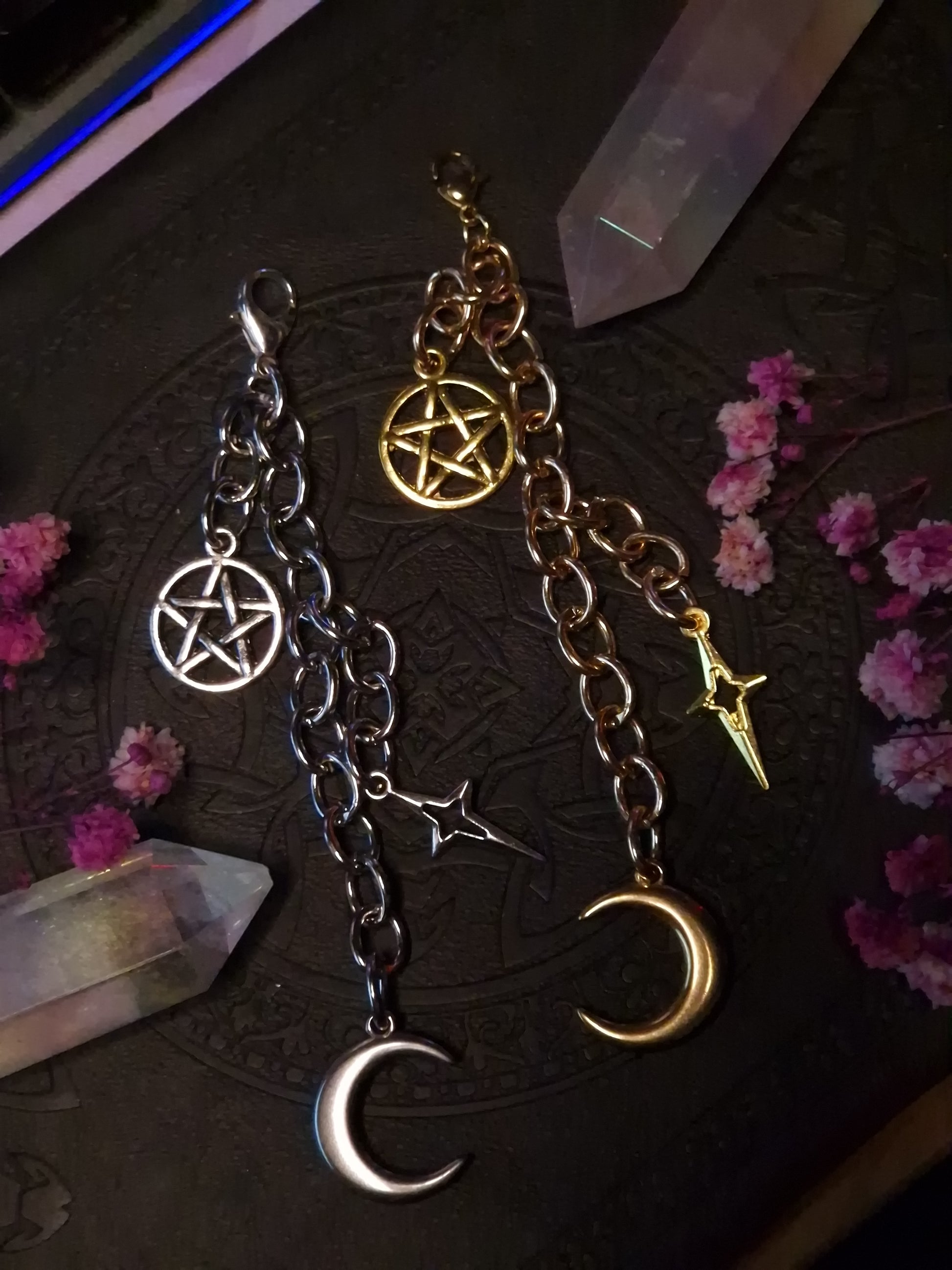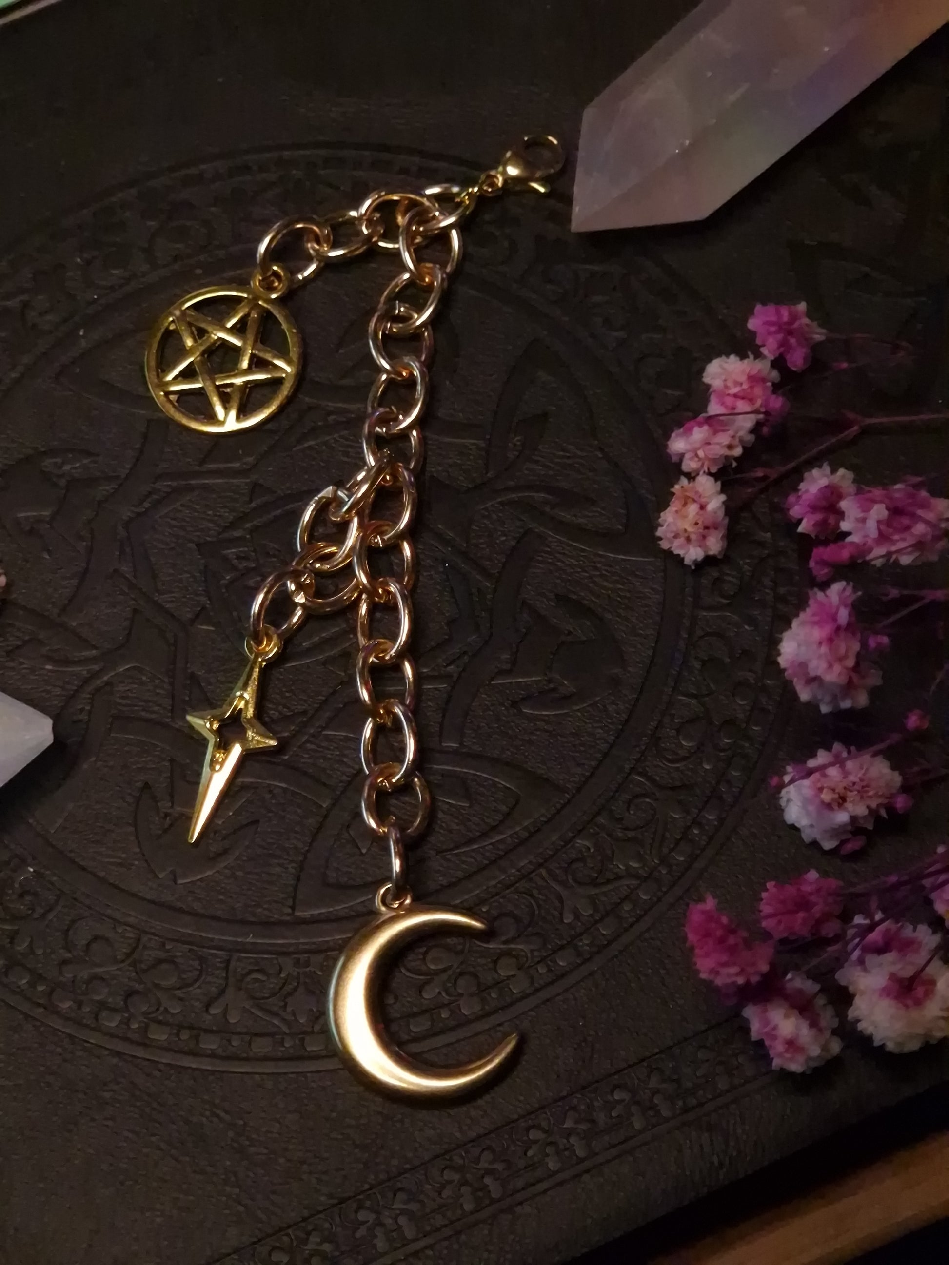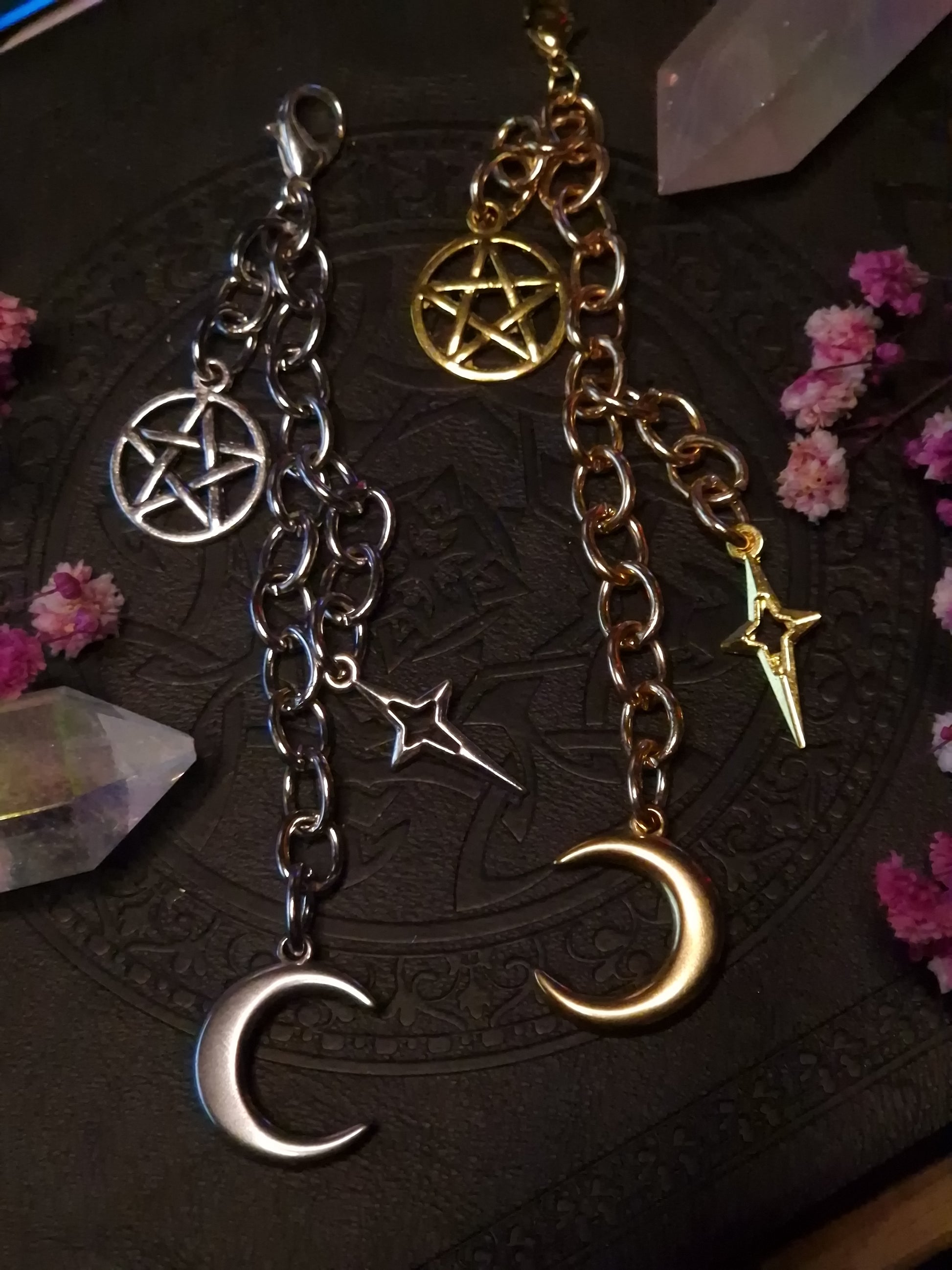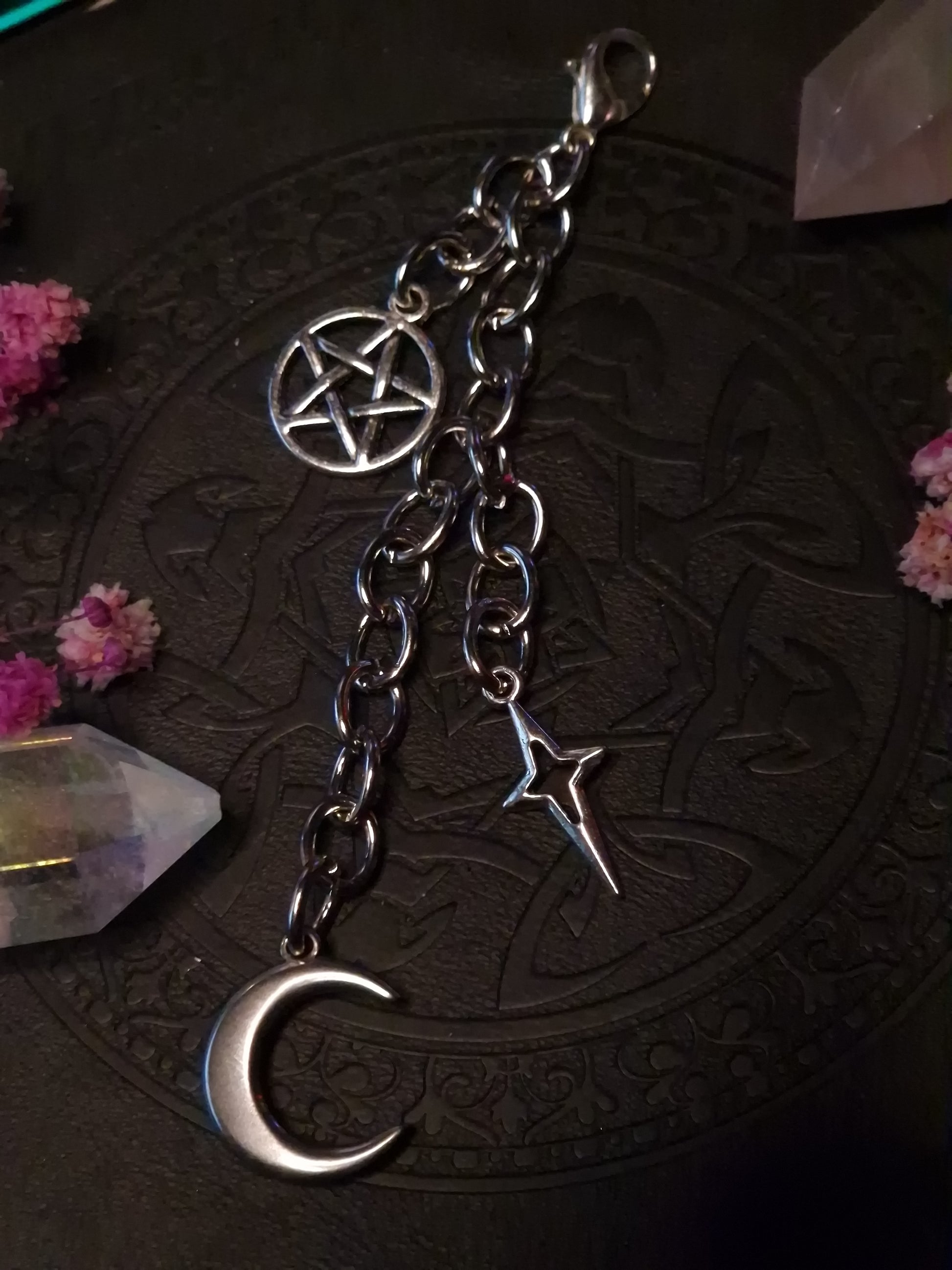 Dieser Anhänger verwandelt jede Haarnadel in ein kraftvolles Schmuckstück voller Mystik. Pentagramm, Stern und Sichelmond vereinen sich in einer filigranen Komposition aus Ketten und Symbolen – ein Ausdruck von Schutz, Balance und kosmischer Anmut.