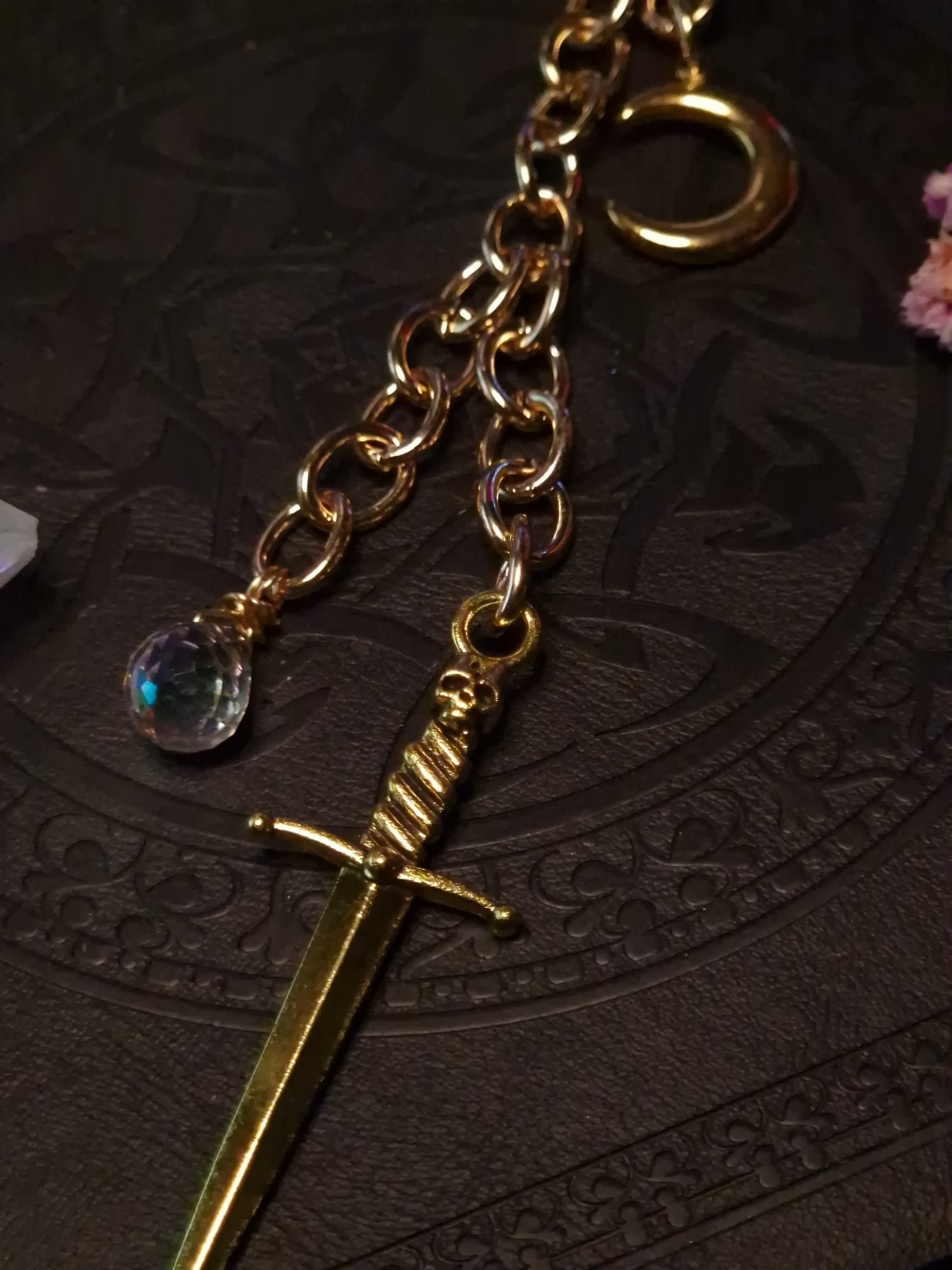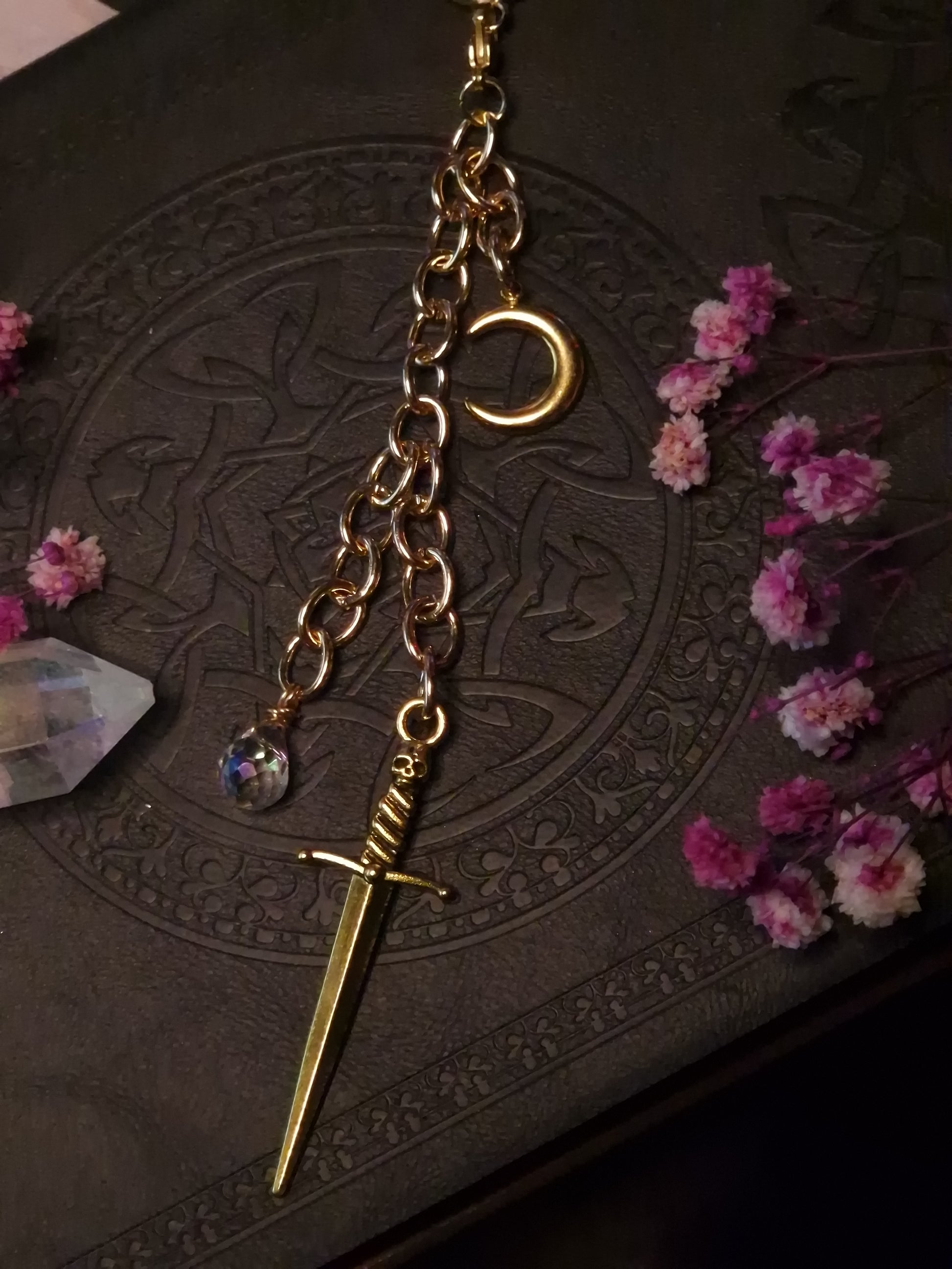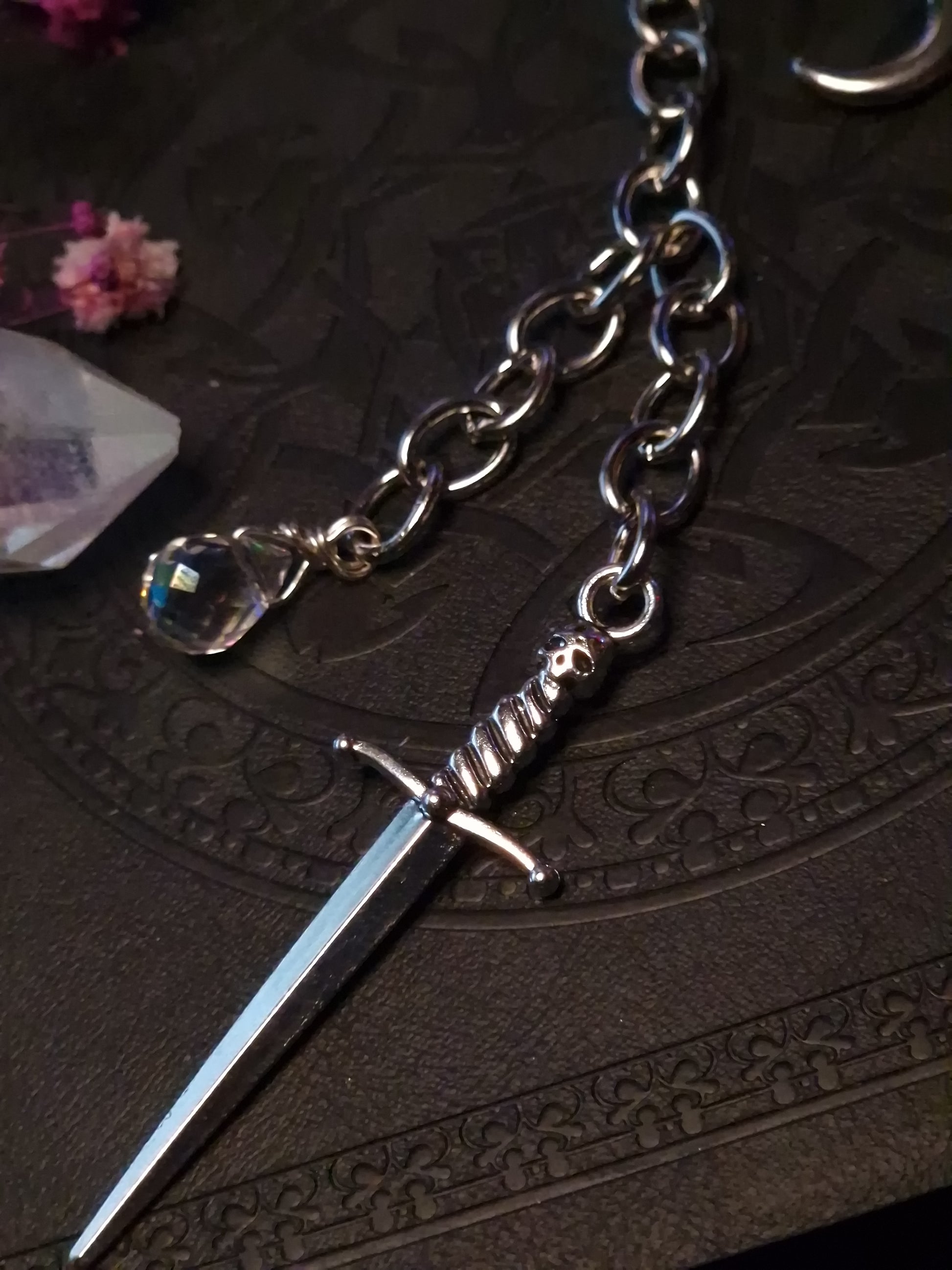 Ob Kriegerin oder Sternentänzerin – diese detailreiche Haarnadel in Schwertform vereint Eleganz mit Macht. Verziert mit einem schimmernden Halbmond und einer funkelnden Kristallperle, bringt sie magische Raffinesse in jedes Styling.