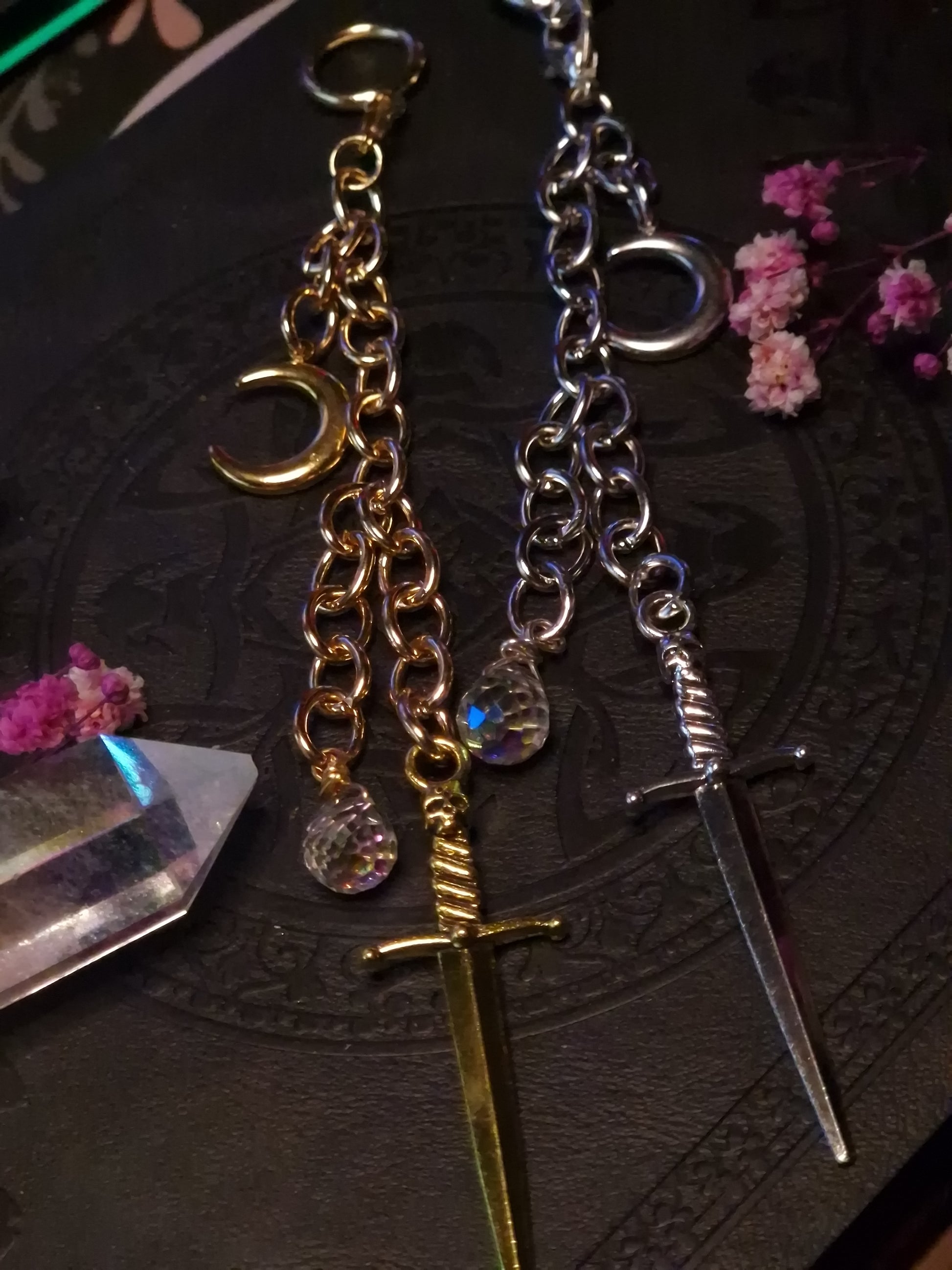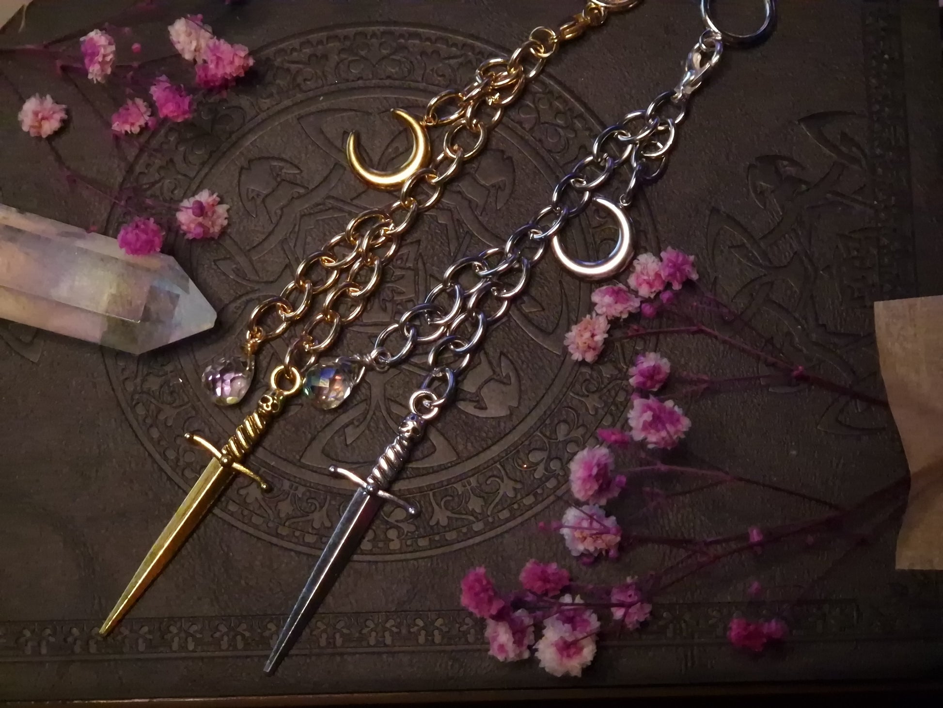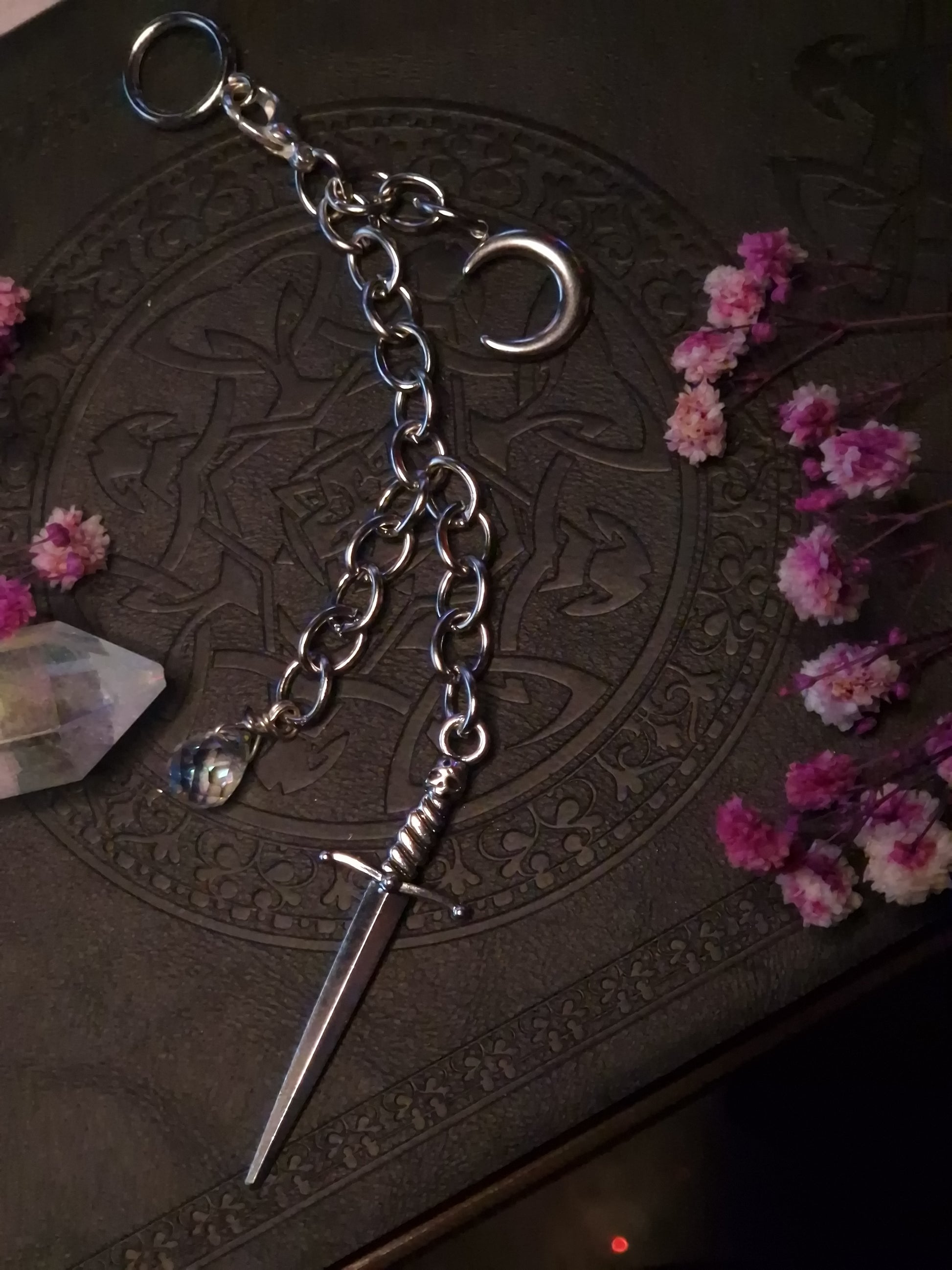 Ob Kriegerin oder Sternentänzerin – diese detailreiche Haarnadel in Schwertform vereint Eleganz mit Macht. Verziert mit einem schimmernden Halbmond und einer funkelnden Kristallperle, bringt sie magische Raffinesse in jedes Styling.