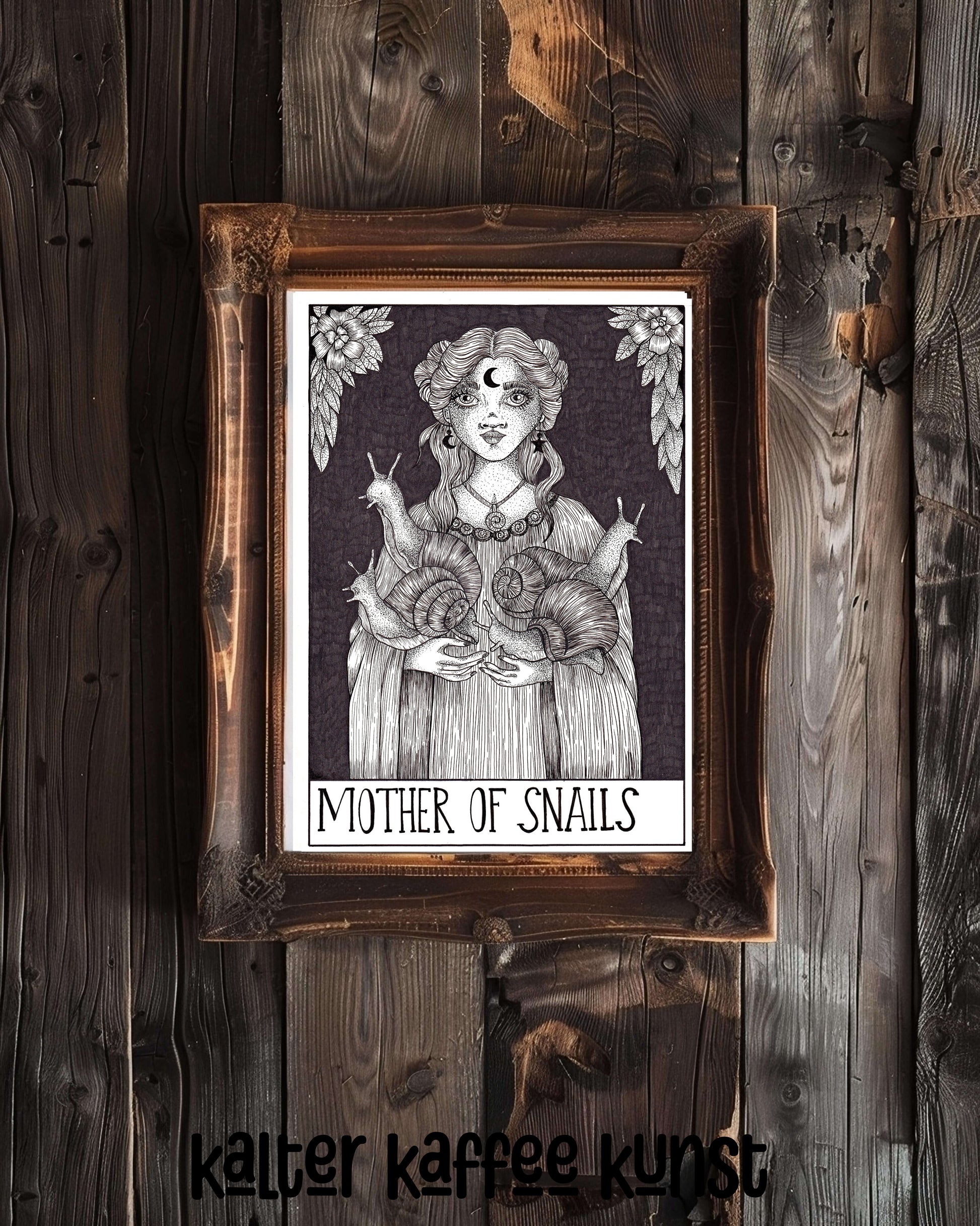 Der Art Print „Mother of Snails“ ist ein einzigartiges Werk in Finelineart, das eine geheimnisvolle Frau in einem langen, wallenden Kleid zeigt. In ihren Armen hält sie große Schnecken – ein Motiv, das zugleich zart, kraftvoll und mystisch wirkt. Inspiriert vom Tarotkarten-Stil verbindet dieses Bild Symbolik, Natur und Fantasie zu einem besonderen Kunstwerk.