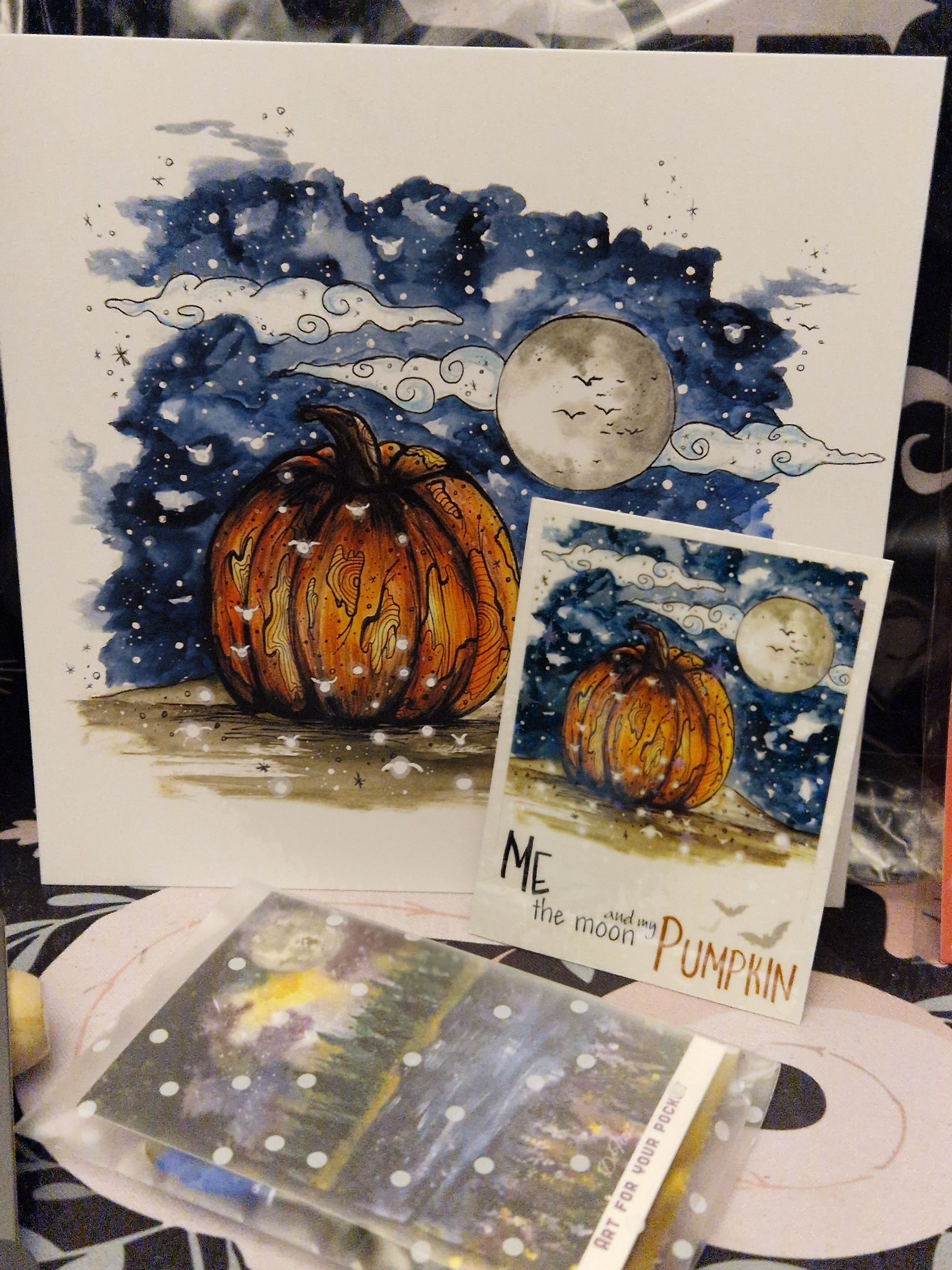 Eine Kürbis Postkarte sowie passender Sticker von DefizitArts