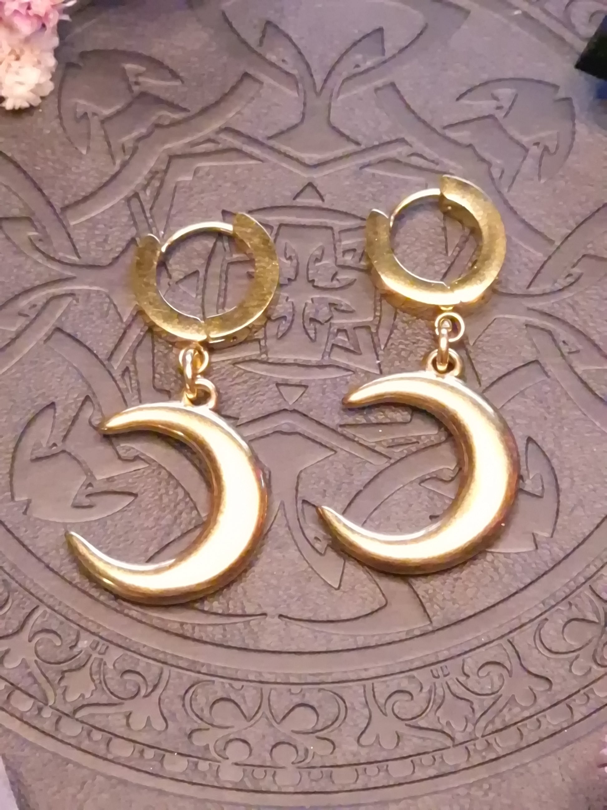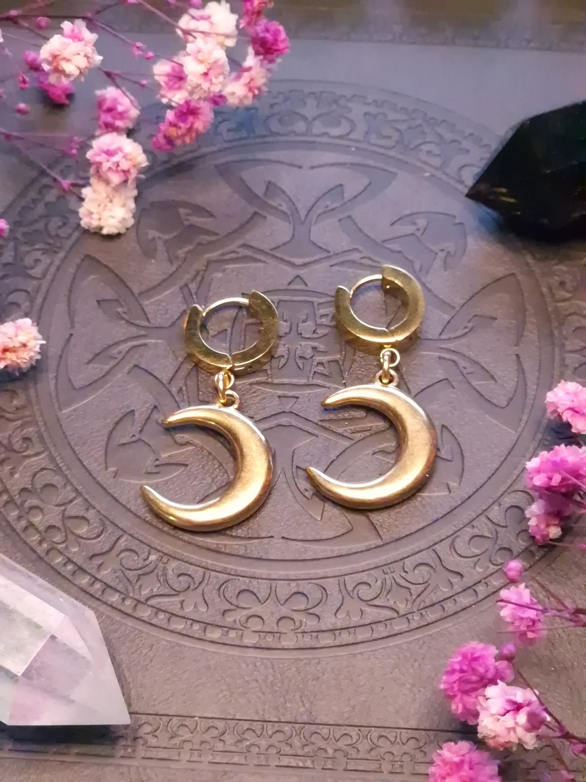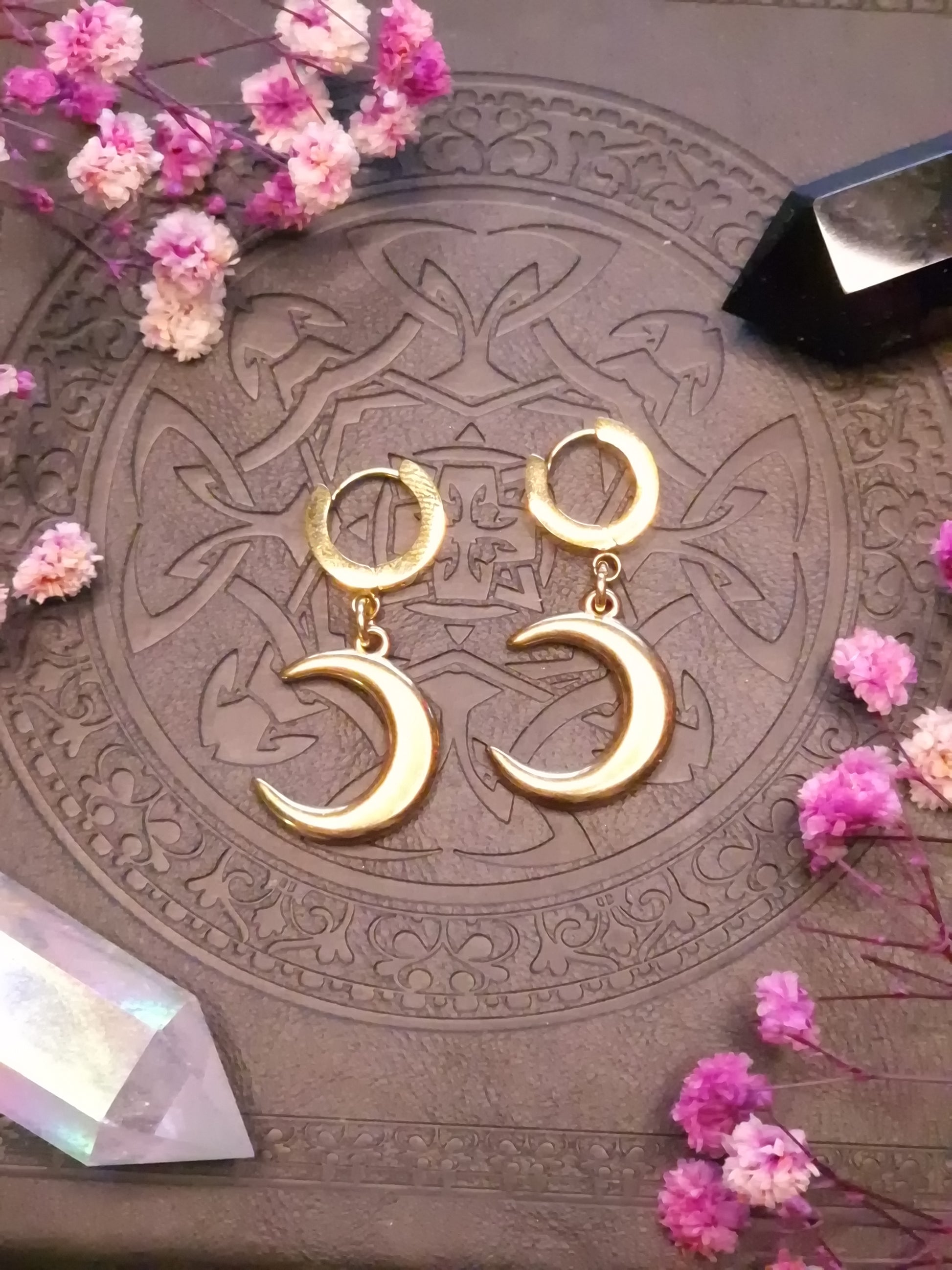 Diese eleganten Creolen tragen zarte Halbmond-Anhänger in sattem Goldton – ein Symbol für Wandel, Weiblichkeit und nächtliche Magie. Sie bewegen sich leicht mit, schwingen sanft über die Schultern und fangen das Licht in faszinierenden Nuancen ein.