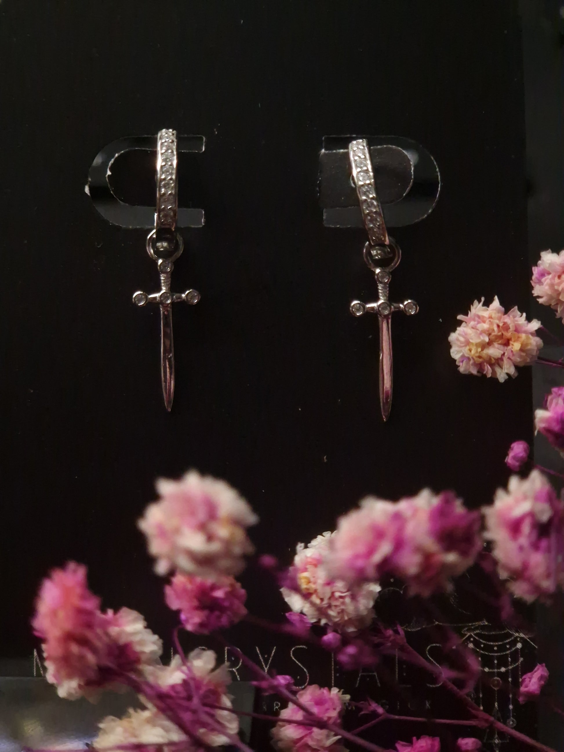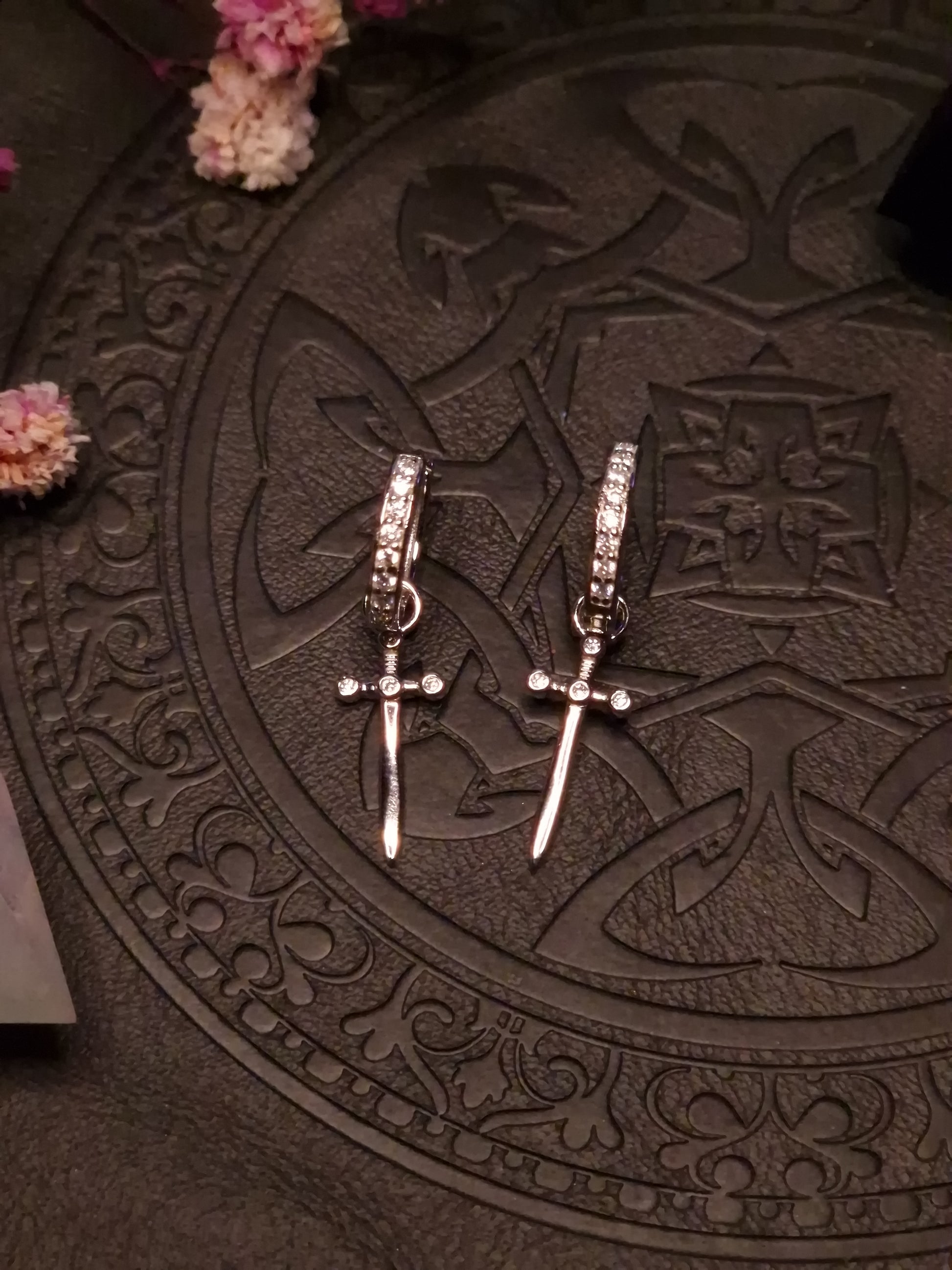 Diese eleganten Creolen tragen kleine Schwertanhänger aus glänzendem Metall, kombiniert mit strahlenden Zirkon-Steinen – ein kraftvolles Duo aus mutigem Symbol und funkelnder Klarheit.
