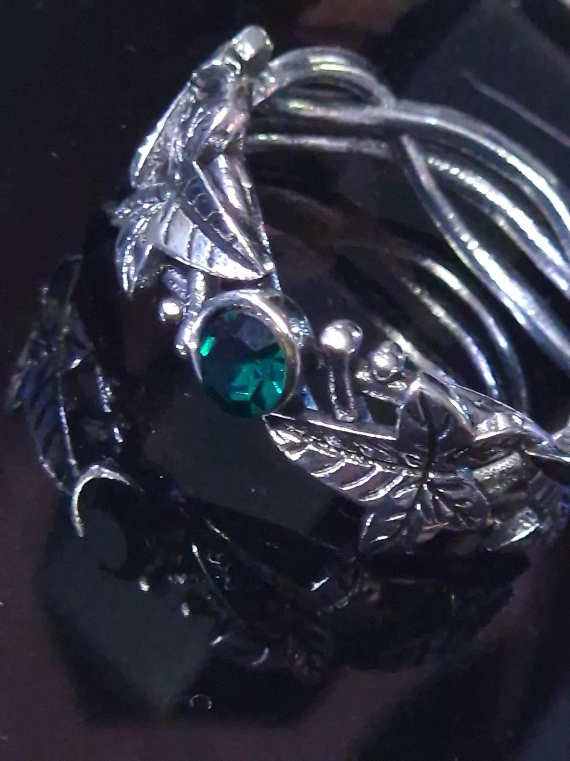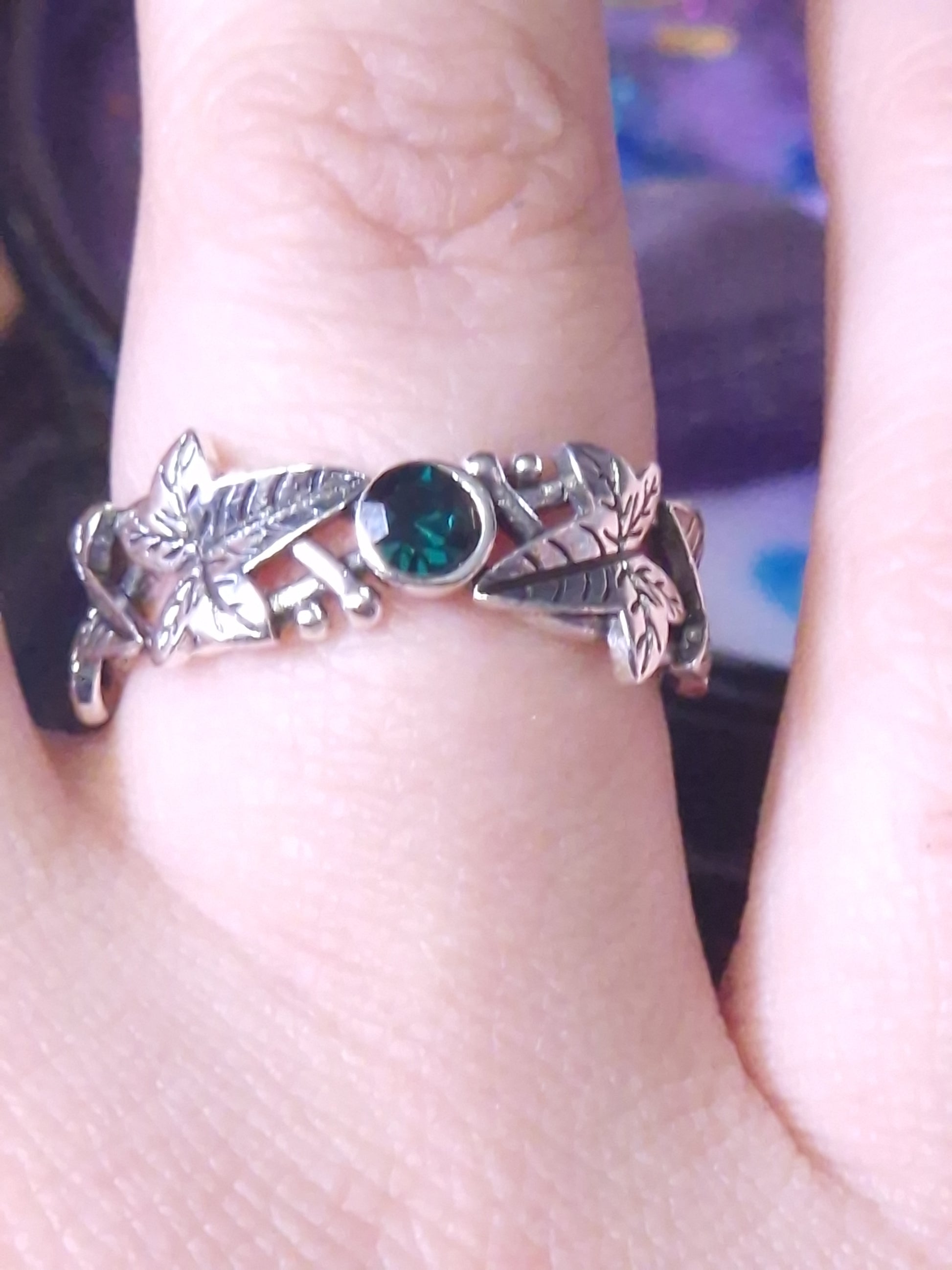 Der Efeu steht für Wachstum, Verbundenheit und ewige Treue – er windet sich unaufhörlich weiter und symbolisiert Harmonie und Beständigkeit. Der grüne Zirkon wirkt wie ein Morgentau eingefangen im Stein – er verleiht Kraft, Hoffnung und leise Naturmagie.