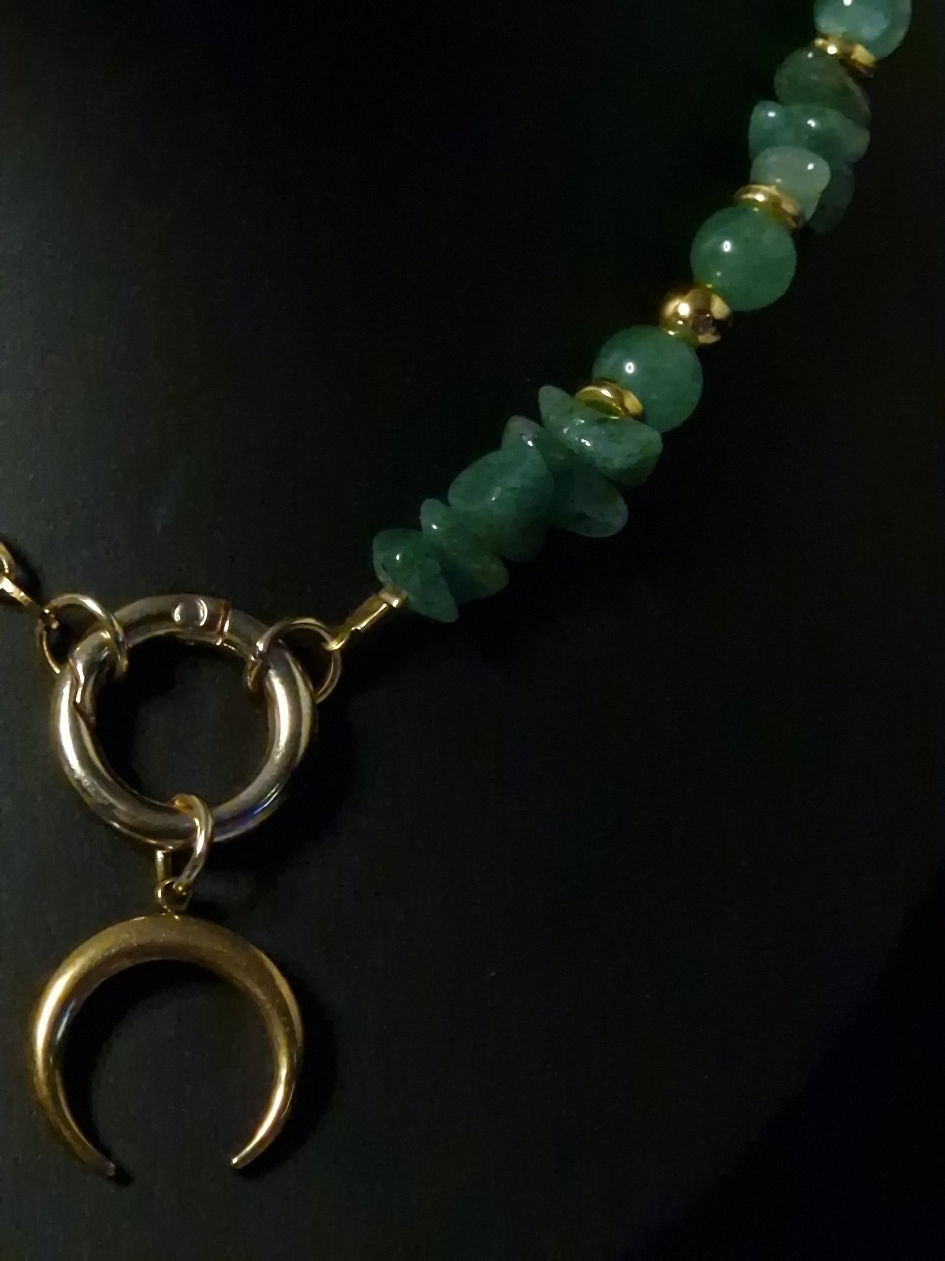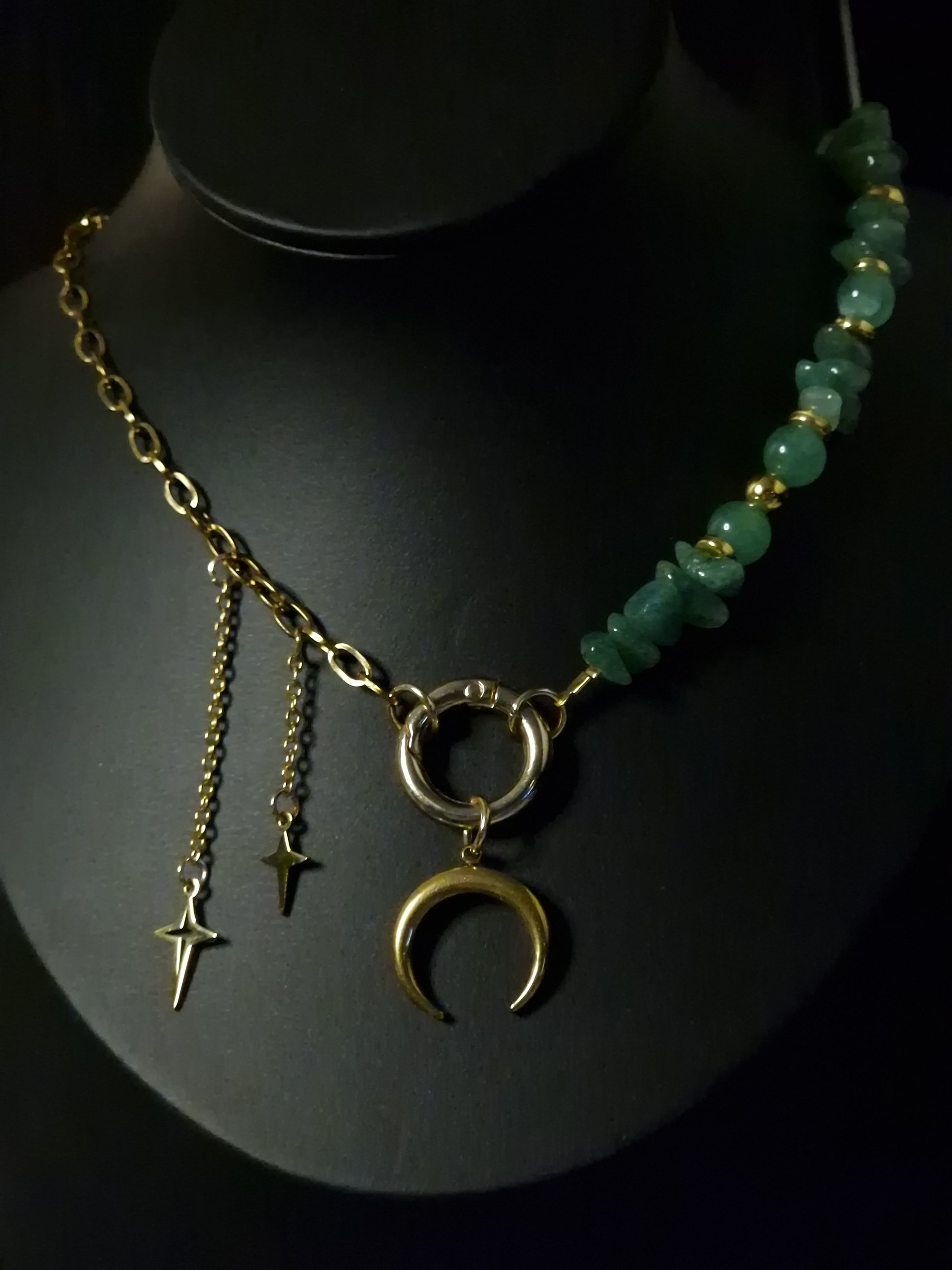 Diese Halskette verbindet klare Formen mit feinen Details. Der halbmondförmige Anhänger ruht unter einem markanten Ringverschluss, ergänzt durch zarte Sternakzente und eine Seite aus facettierten grünen Edelsteinperlen.