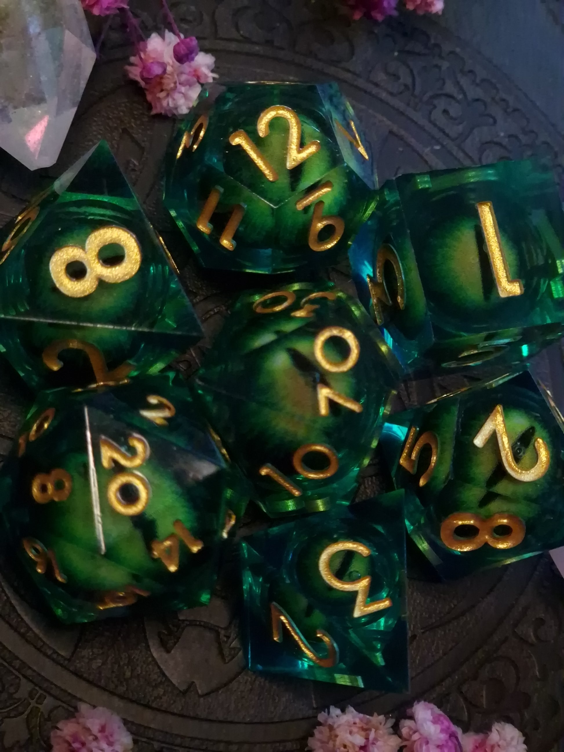 Jedes dieser sieben handgefertigten Polyeder birgt ein geschliffenes Drachenauge, das in einer lebendigen Flüssigkeit schwebt – und bei jedem Wurf majestätisch deine Aufmerksamkeit einfängt.