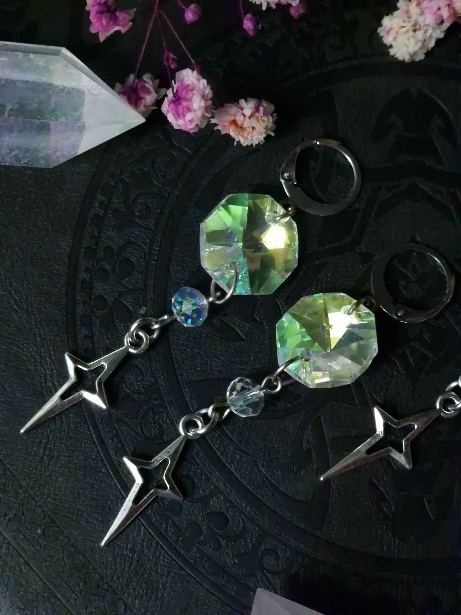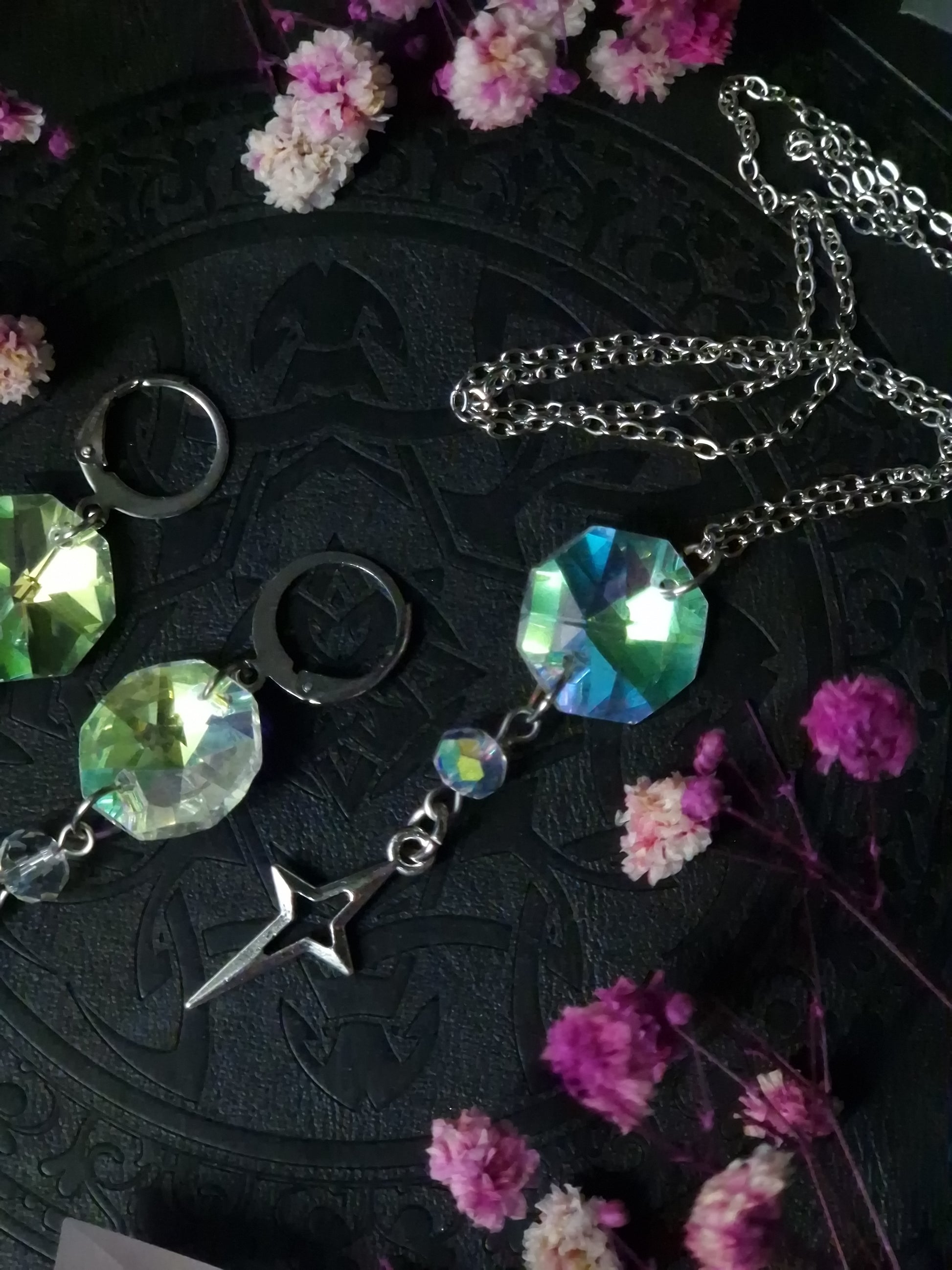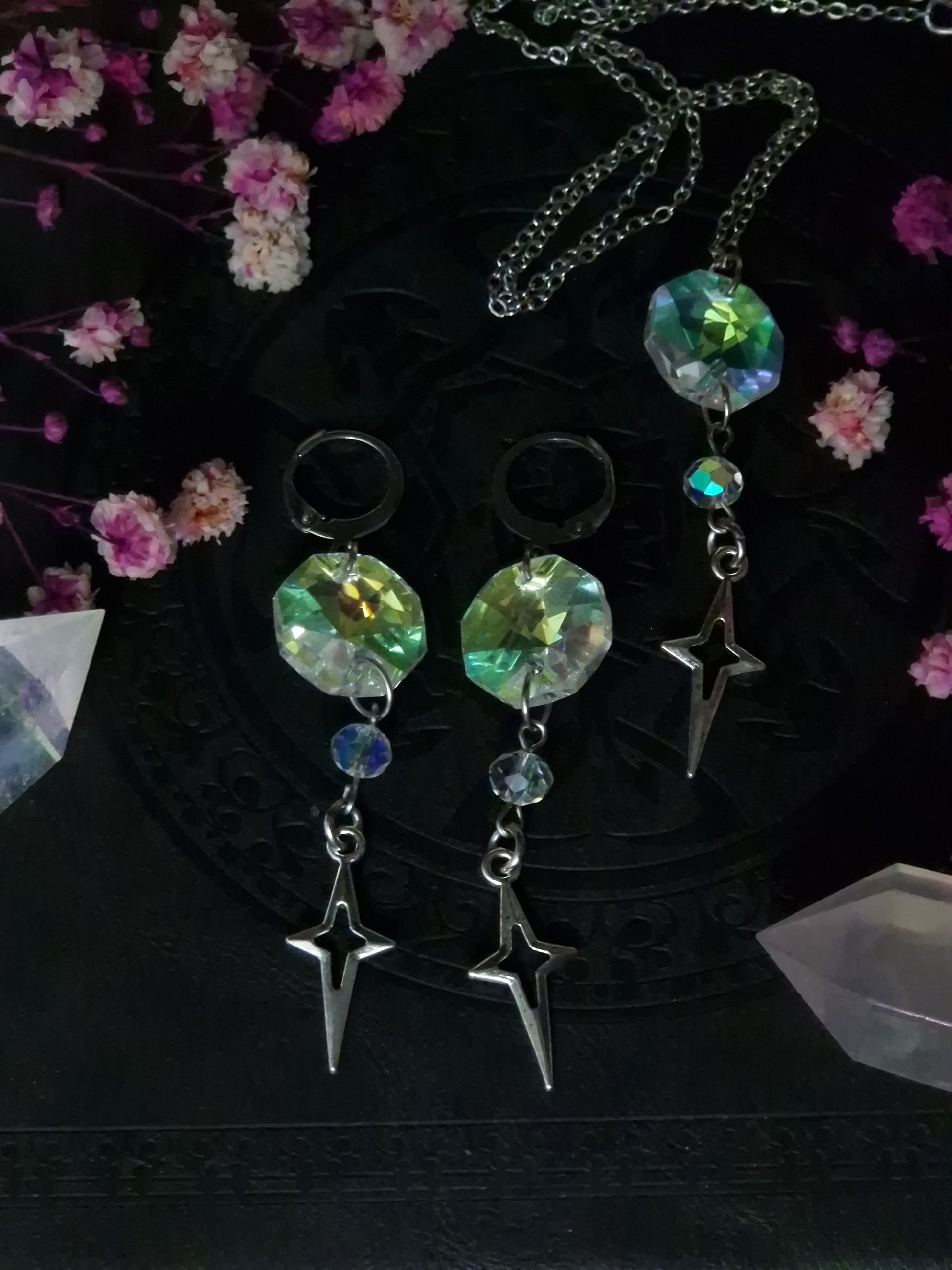 Die prismatischen Kristalle brechen das Licht in regenbogenhafte Schimmer – perfekt für magische Nächte oder Tageslooks, die dich strahlen lassen wollen. Der zusätzliche Sternanhänger sorgt für extra Verspieltheit und Tiefe.