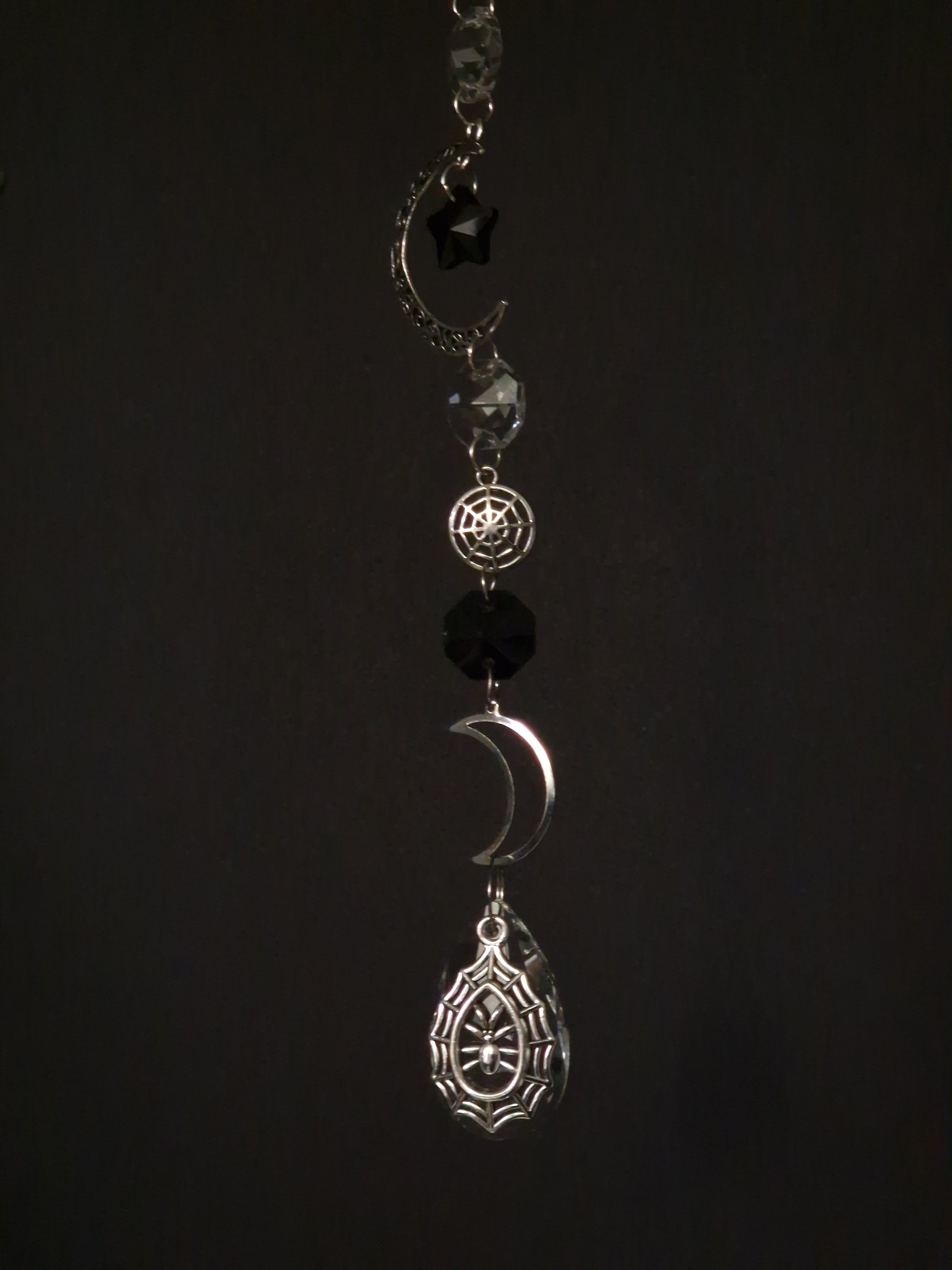 Zart wie ein Morgentau, geheimnisvoll wie die Nacht – Dieser filigrane Sonnenfänger mit kleinem Spinnennetz-Motiv vereint feine Handwerkskunst mit einer Prise dunkler Magie. Die schimmernden Kristalle in klaren und tiefen Schwarztönen fangen das Licht ein und brechen es in kleine Regenbogen – wie magische Fäden, gesponnen von einer unsichtbaren Spinne.