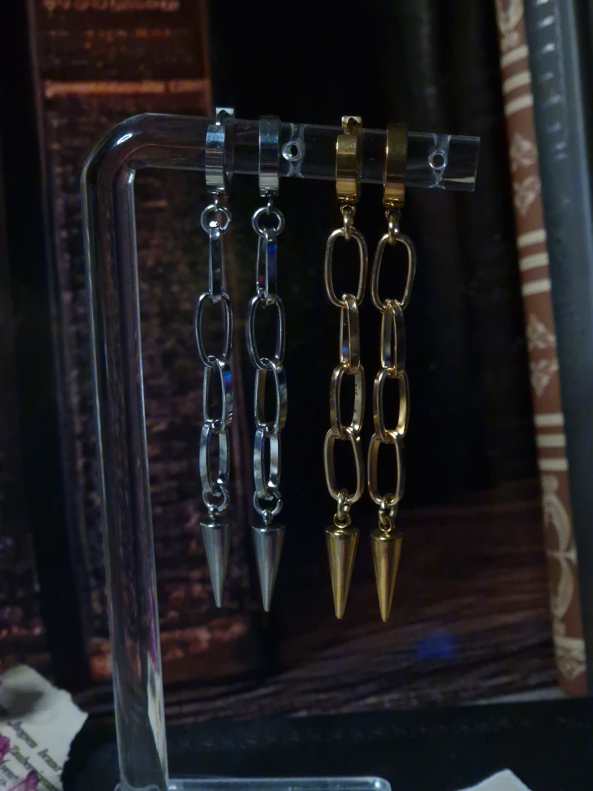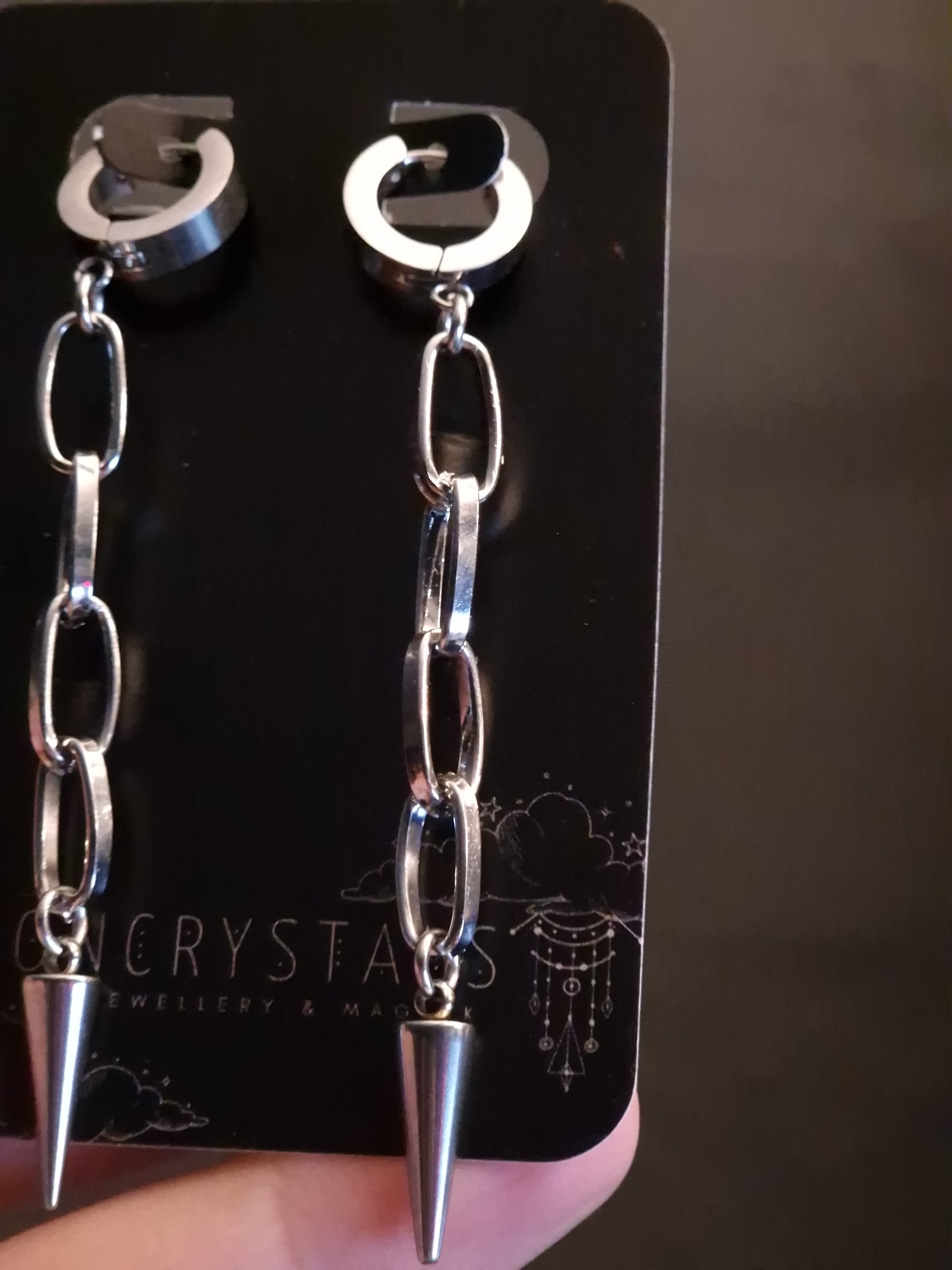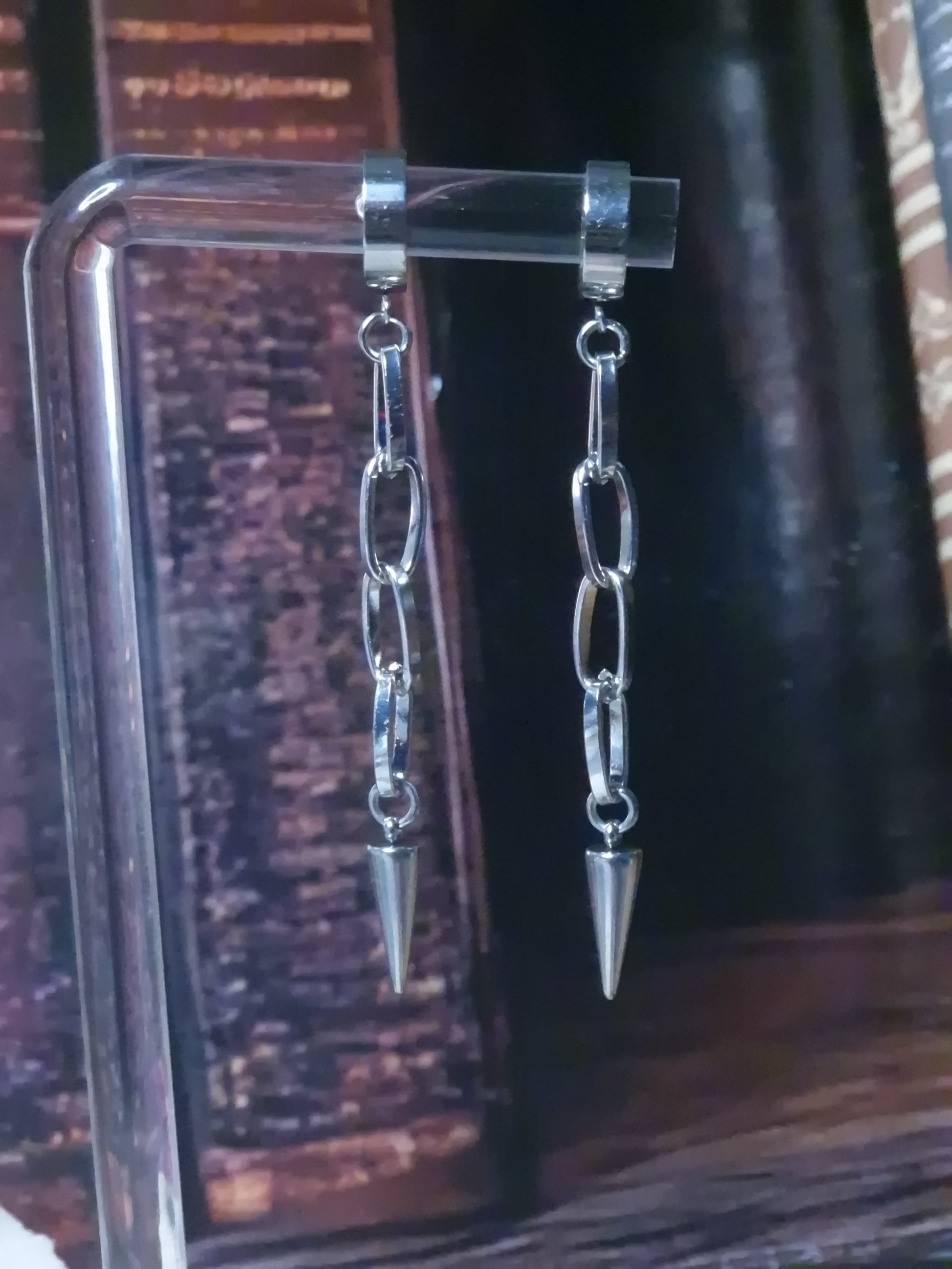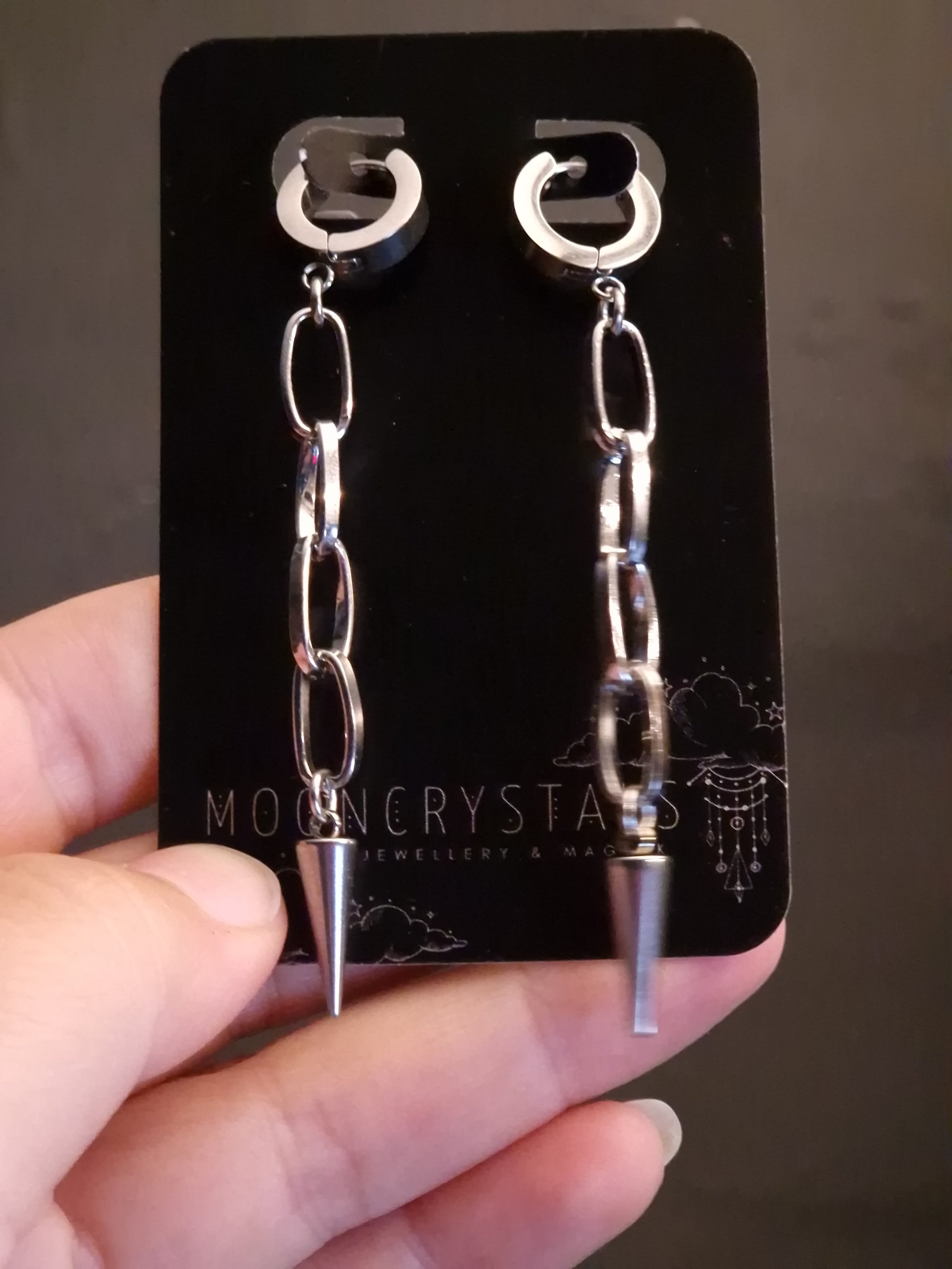 Diese markanten Ohrringe kombinieren glänzenden Edelstahl mit einer Statement-Kettenstruktur und spitzen Spike-Anhängern. Die perfekte Wahl für alle, die klare Kanten lieben und sich modisch nicht festlegen wollen.