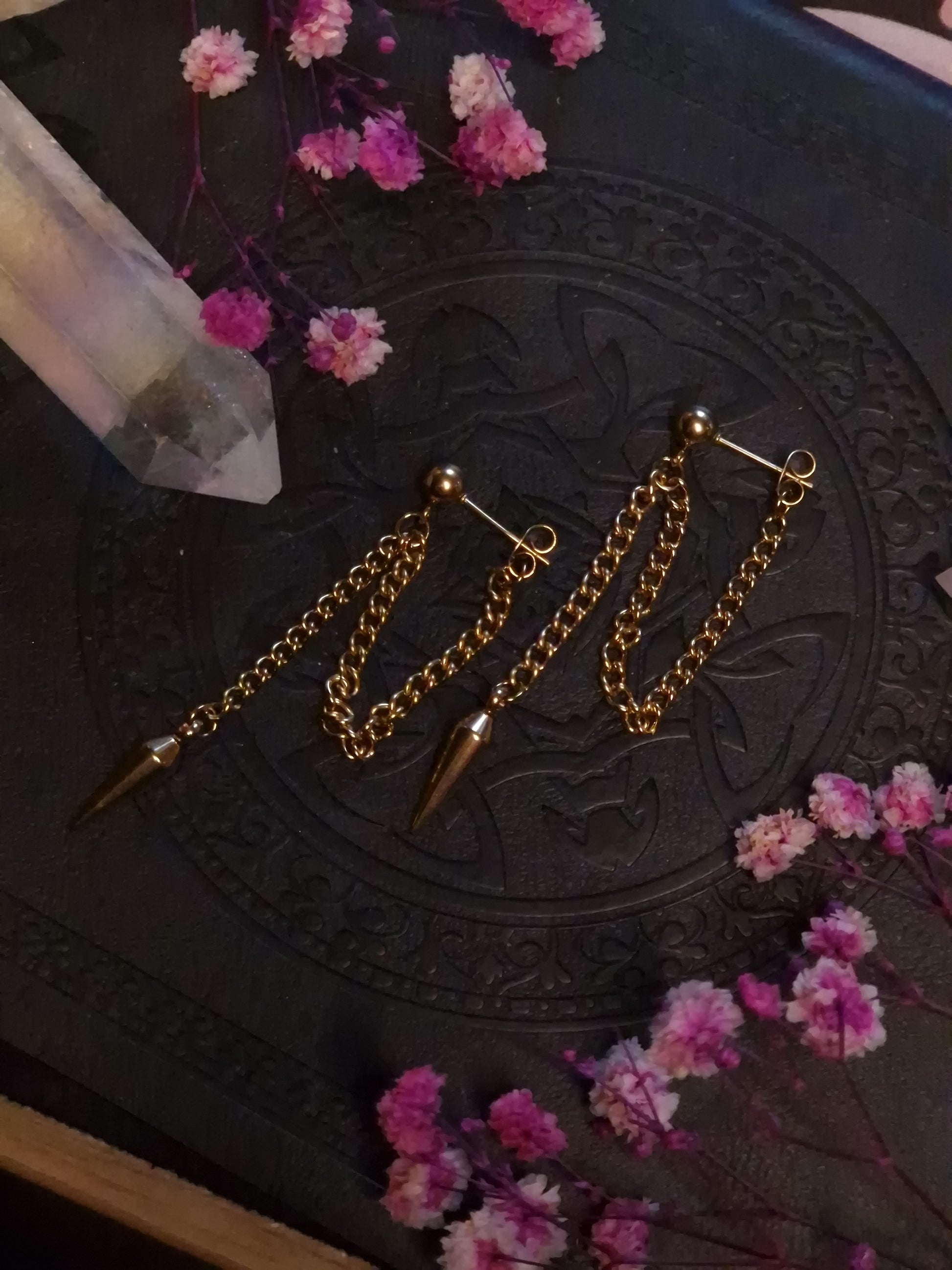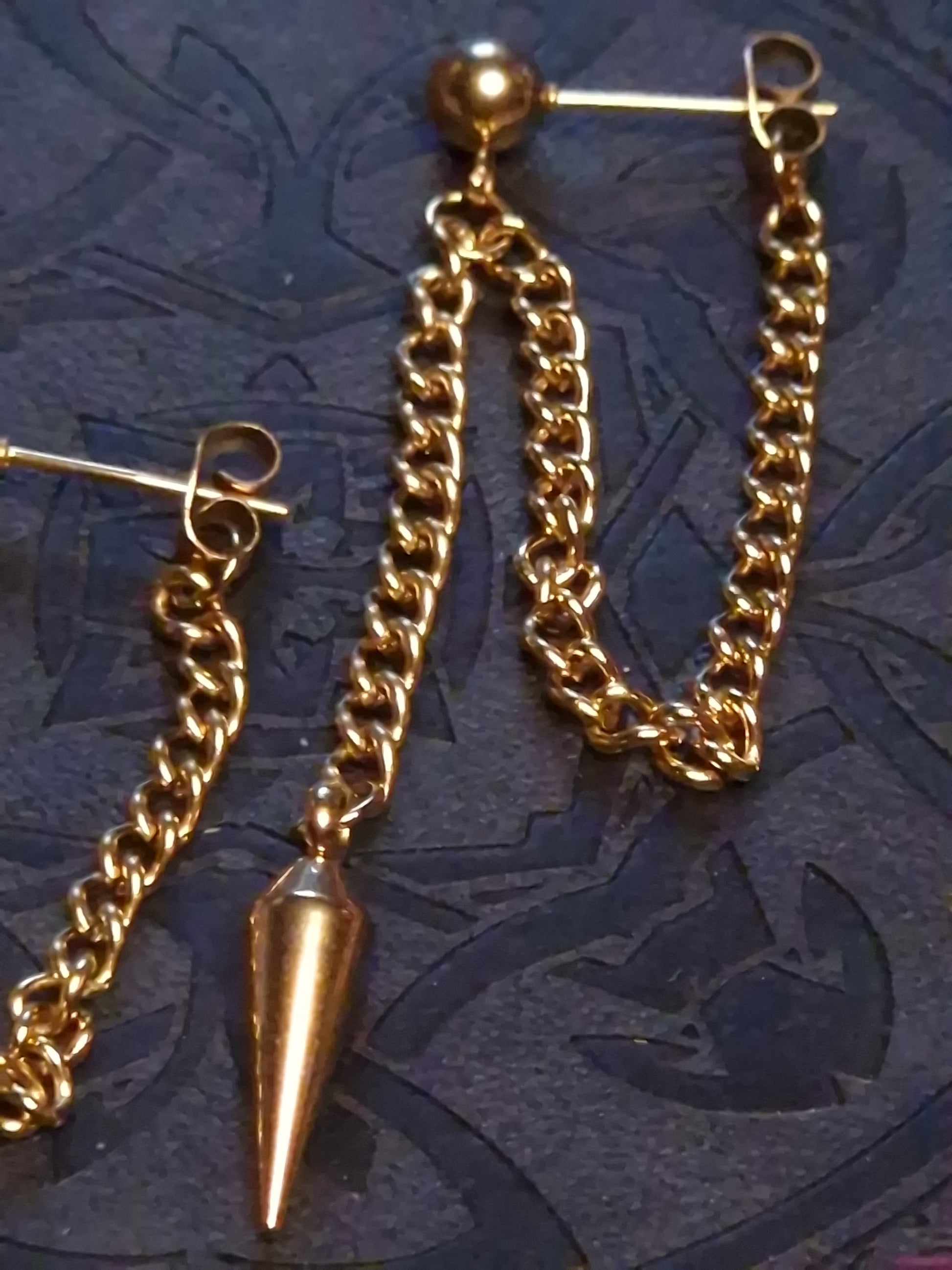 Dieser außergewöhnliche Ohrring vereint minimalistisches Design mit einem Hauch Rebellion. Die doppelte Kette in gold trifft auf einen spitz zulaufenden Anhänger – wie ein kleiner Pendel, der deine dunkle Ästhetik unterstreicht.