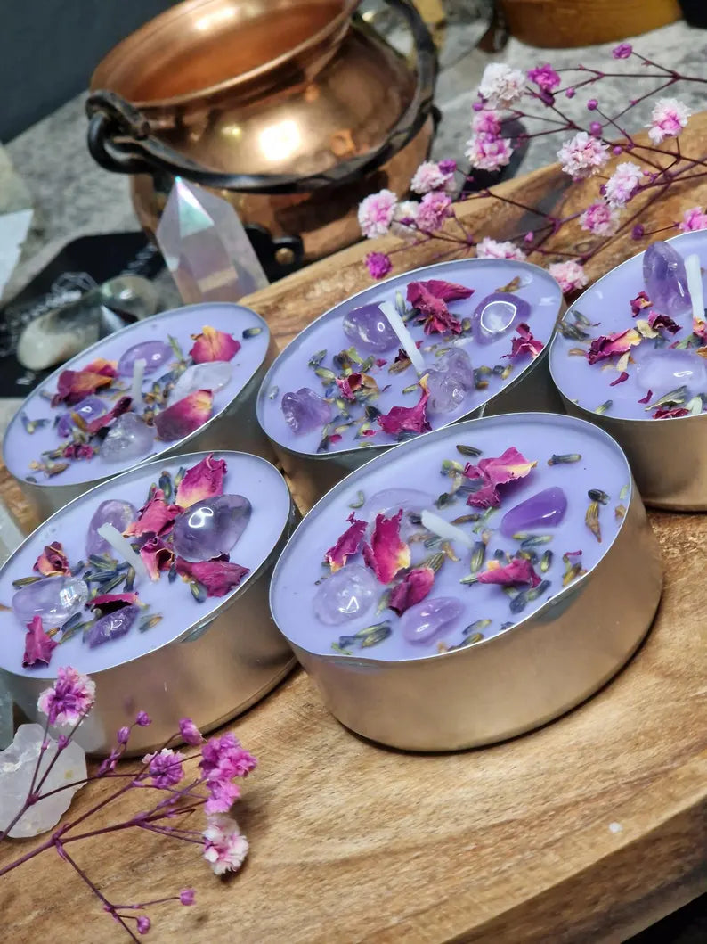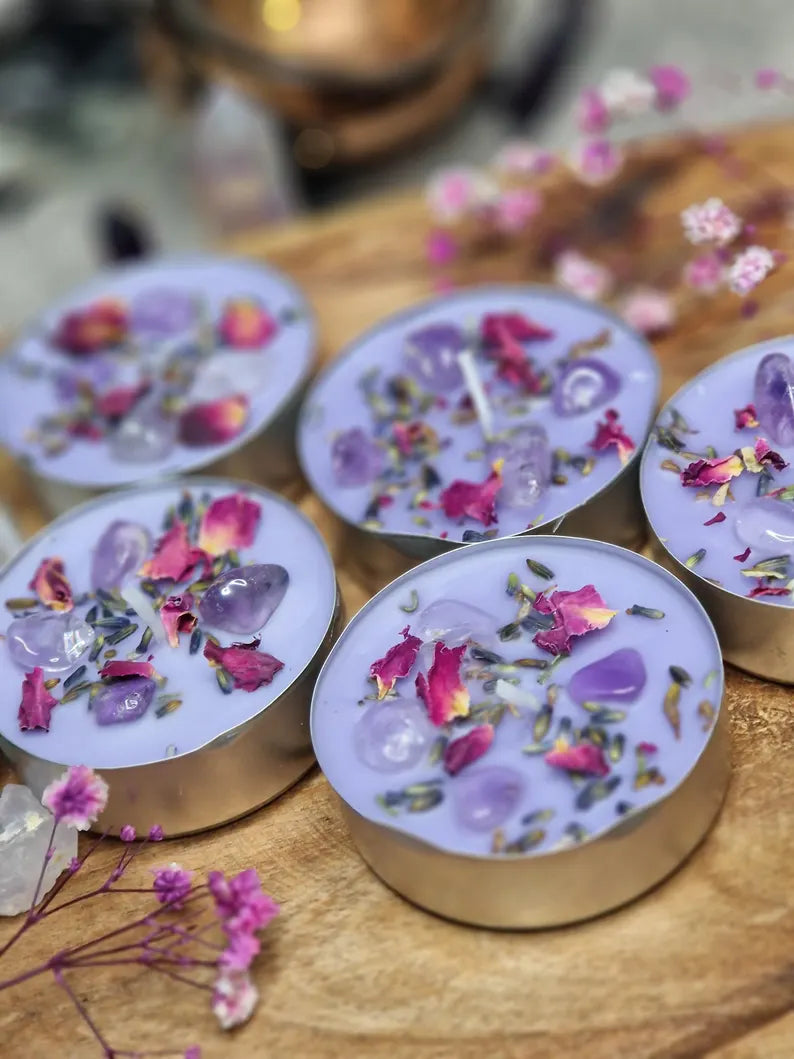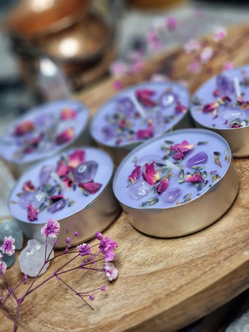Dieses großzügige Teelicht vereint Sanftheit und Kraft: ein violett getöntes Wachs, durchzogen von Lavendelduft und verziert mit Rosenblüten und einem edlen Amethyst-Stein. Eine ruhige Flamme lässt Aromen von Lavendel durch den Raum wehen und schafft eine Atmosphäre, in der Gedanken sanft zur Ruhe kommen.