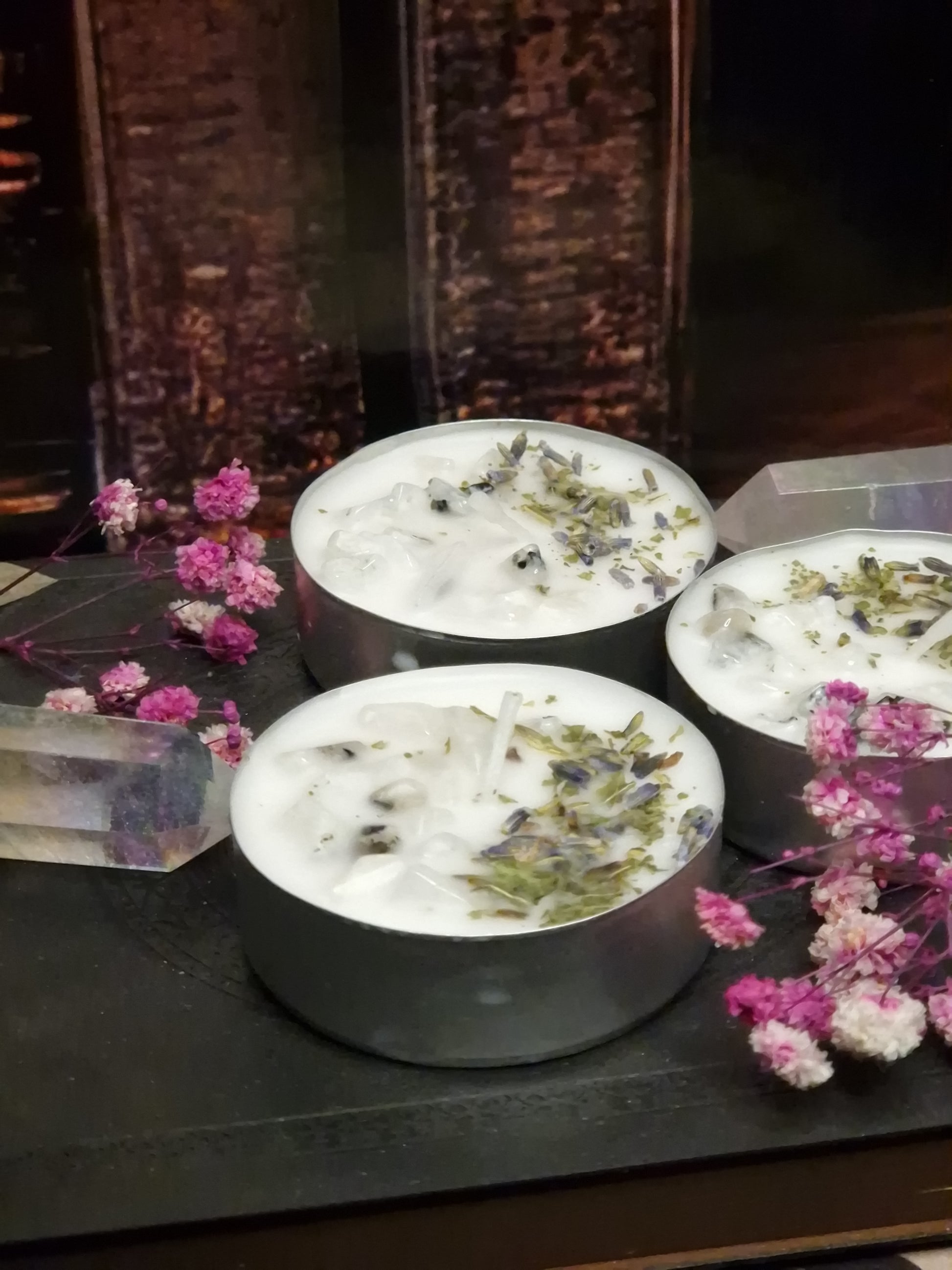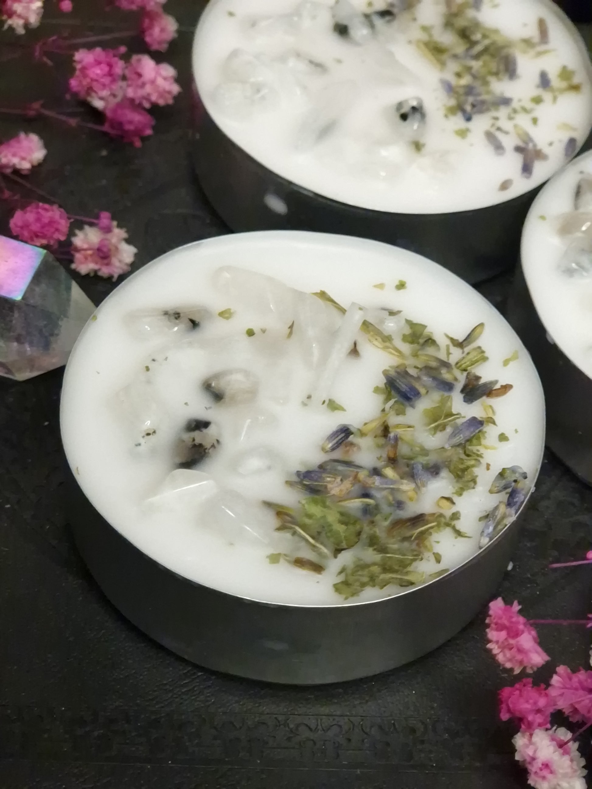 Ein Teelicht, das mit sanfter Präsenz den Vollmond heraufbeschwört: Rein weißes Wachs verschmilzt mit zarten Blüten und einem ausgewählten Amethyst-Kristall – ein Symbol für Intuition, Klarheit und nächtliche Magie. Die Flamme webt ein leises Lichtnetz, das die Dunkelheit erhellt und Räume mit mystischem Zauber füllt.