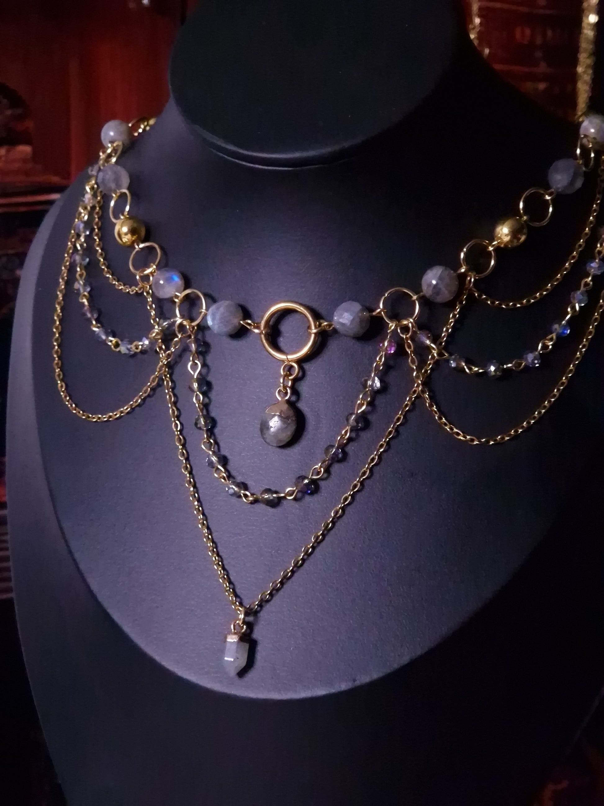 Der Labradorit ist der Stein der Transformation, Intuition und Stärke. Er schützt die Aura, öffnet den Geist für das Magische und erinnert daran, dass Licht selbst in den Schatten lebt. Dieses Collier trägt die Energie des Neuanfangs – kraftvoll und sanft zugleich.
