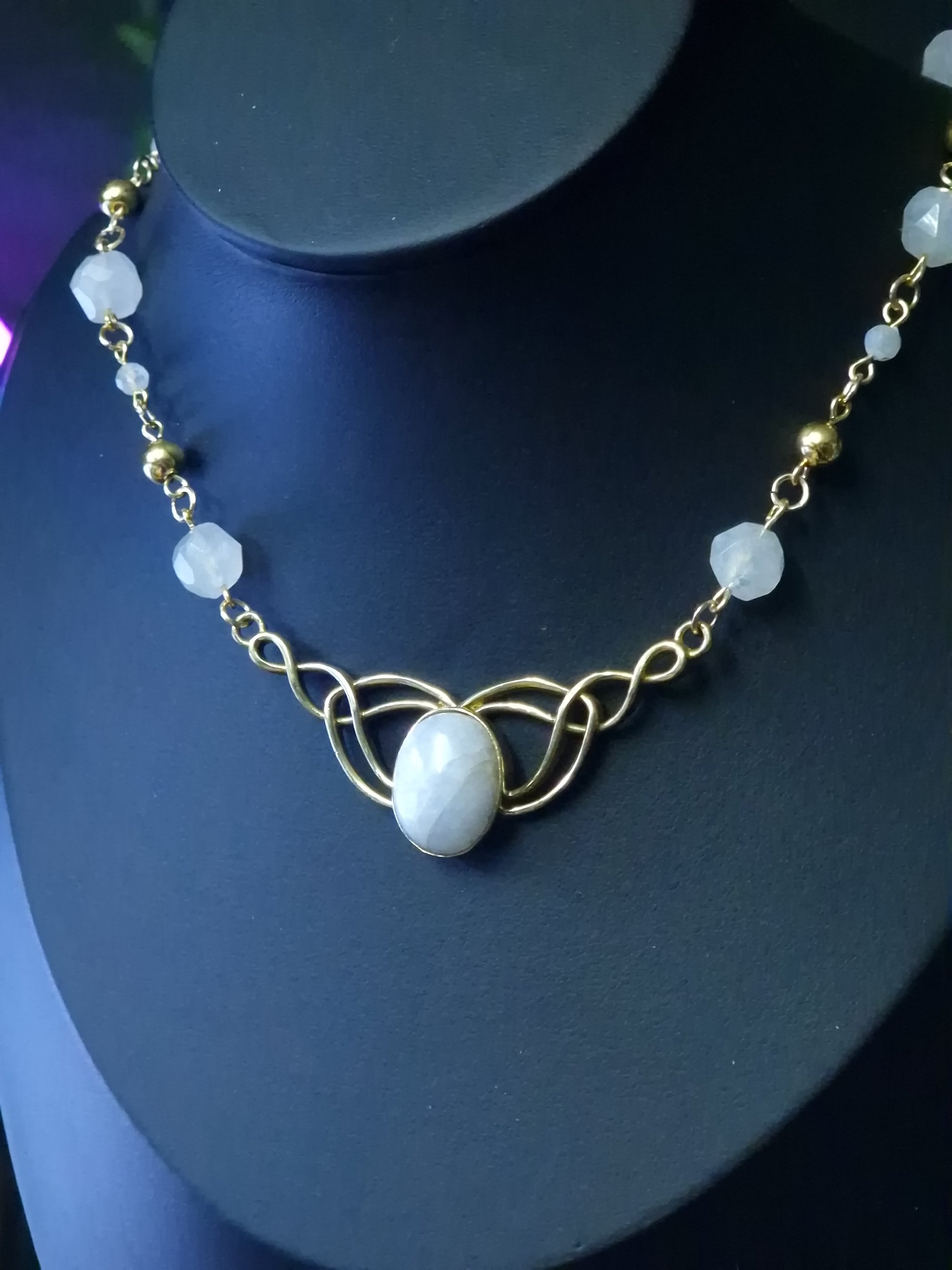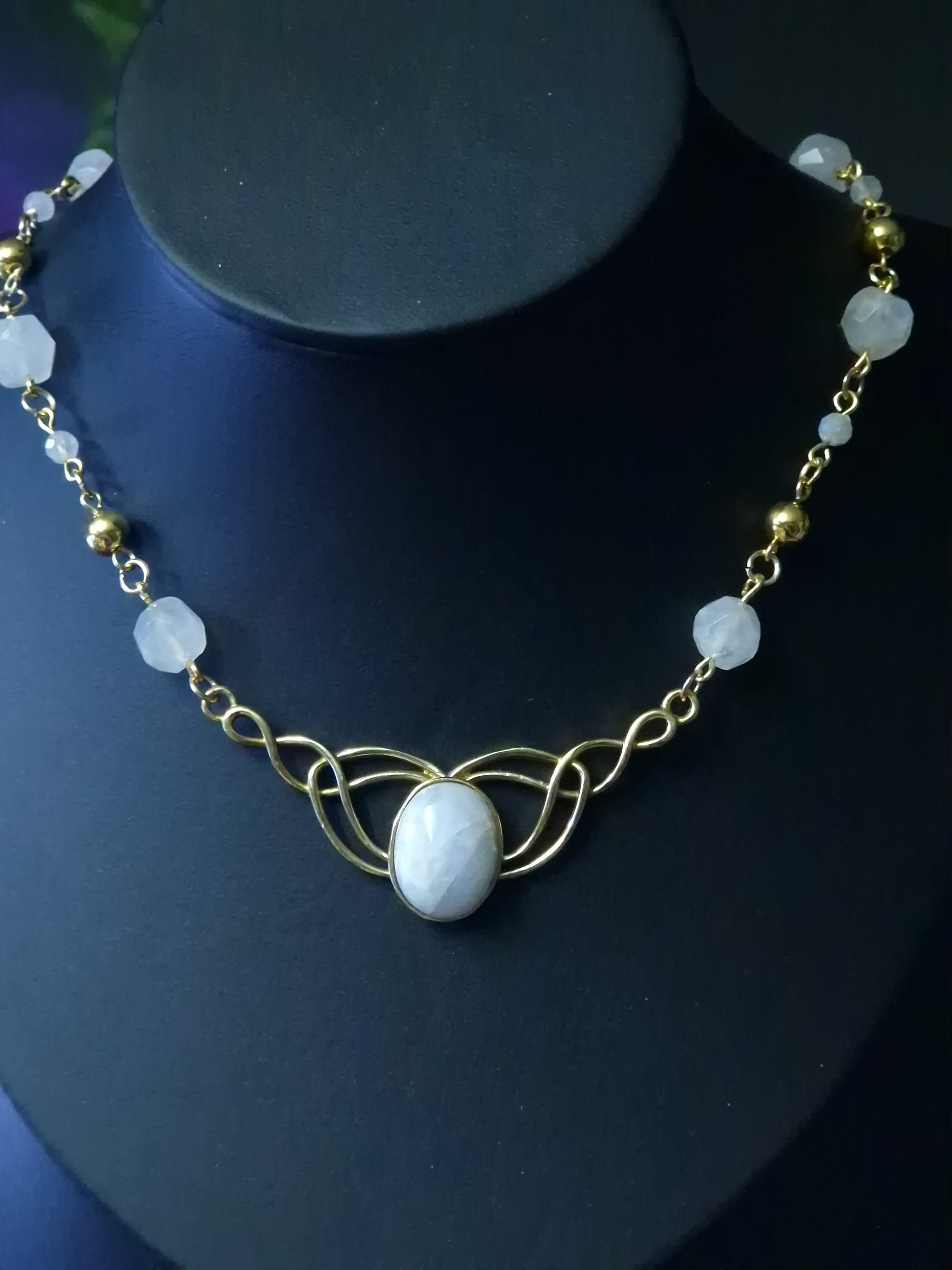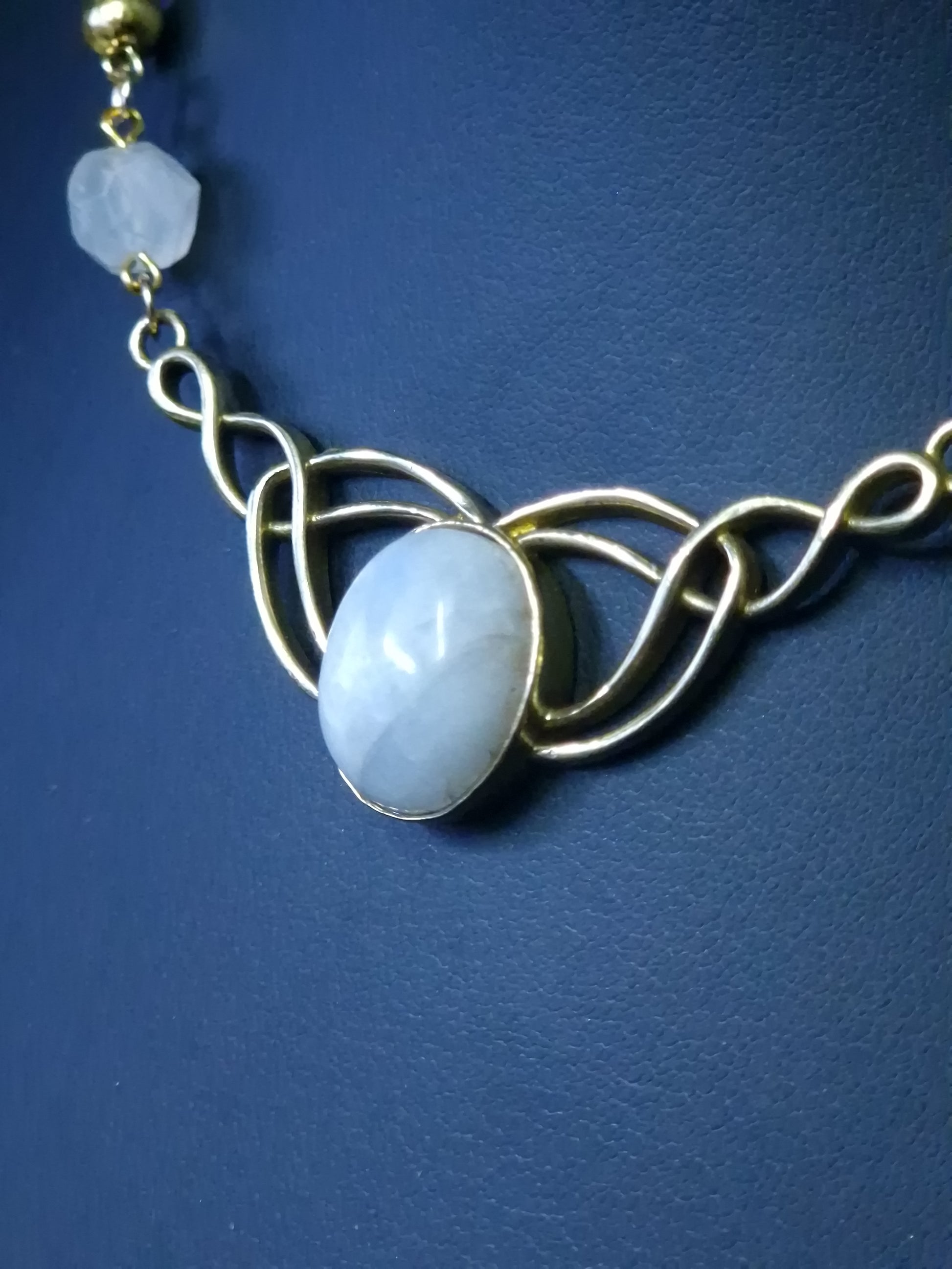 Dieses elegante Collier verbindet elfengleiche Ästhetik mit mystischer Symbolik. Im Zentrum steht ein oval geschliffener Mondstein, eingefasst in eine goldfarbene keltische Knotung – ein Symbol für Ewigkeit, Verbundenheit und Schutz. Feine Mondsteinperlen und goldene Akzente zieren die Kette, die wie aus einer anderen Welt zu stammen scheint.