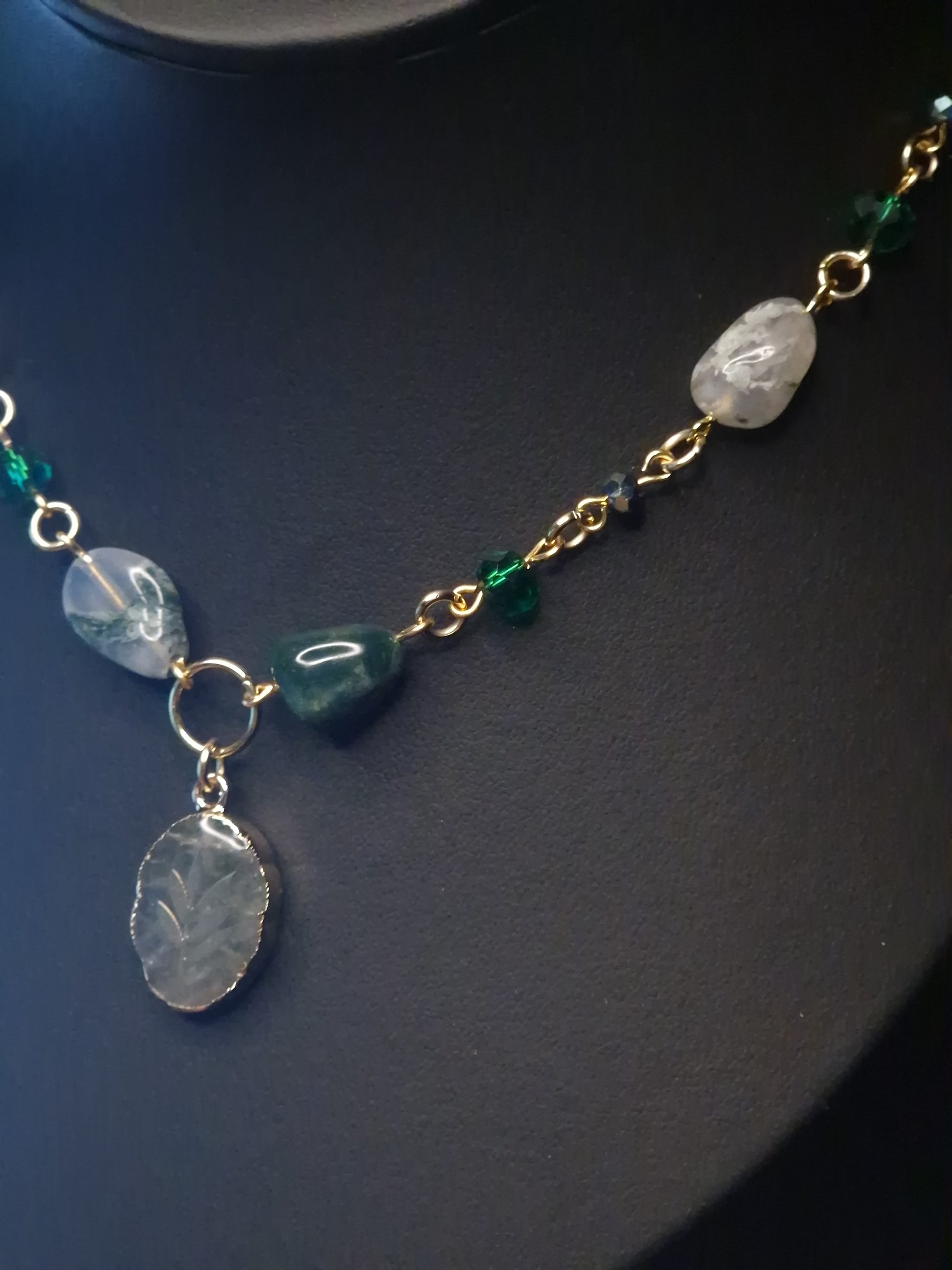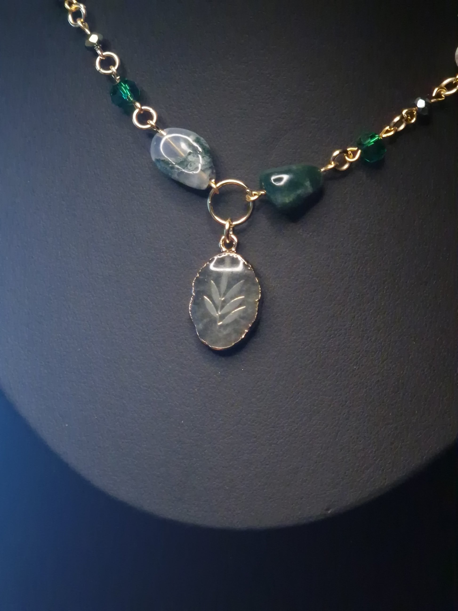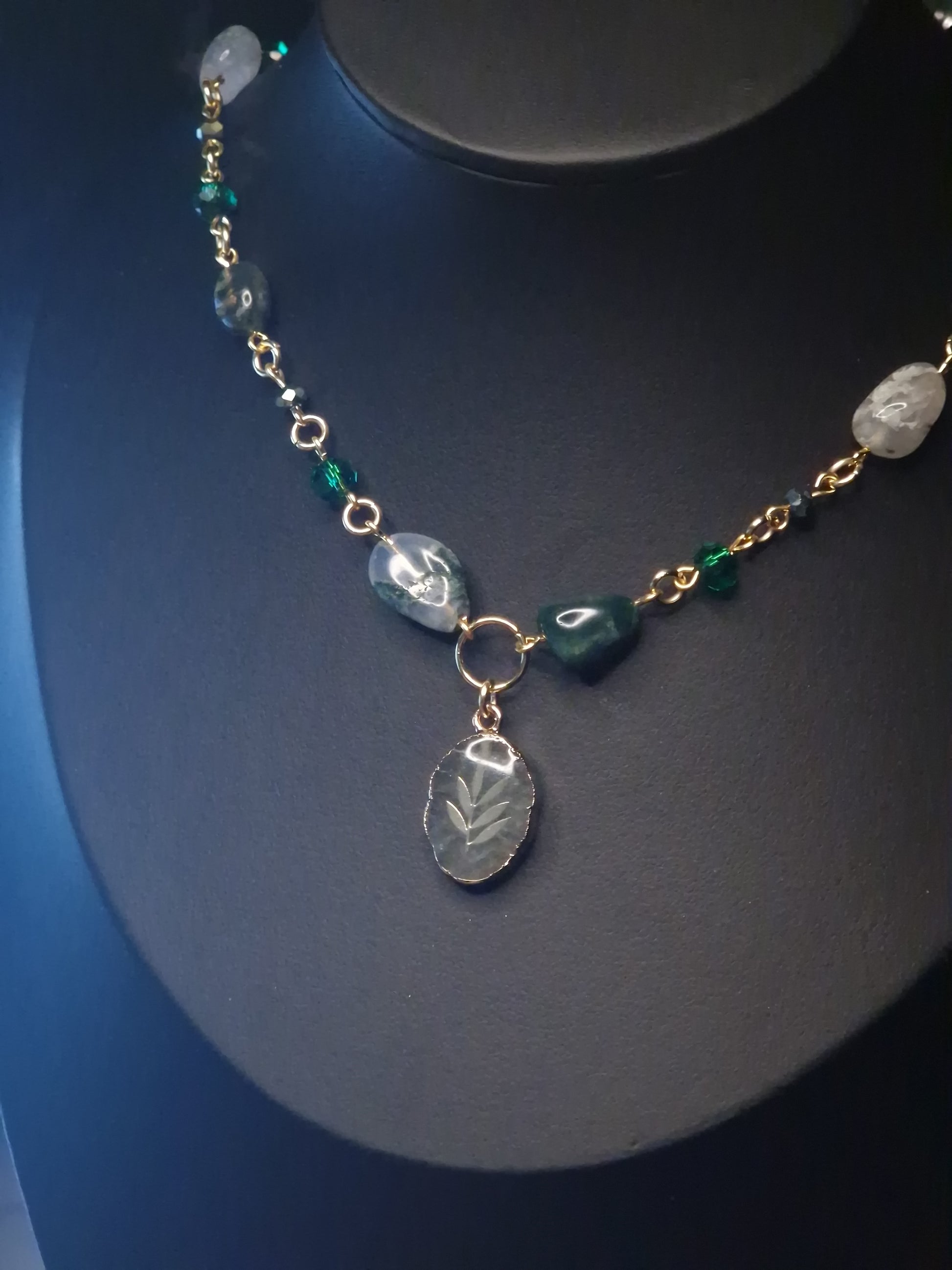 Diese filigrane Kette verbindet tiefes Waldgrün mit funkelnden Akzenten und einem goldenen Anhänger – ein Schmuckstück wie ein leiser Spaziergang durch moosige Pfade bei Morgentau. Die natürlichen Grüntöne der Perlen erinnern an Blätter, Farn und geheimnisvolle Tiefen alter Wälder.