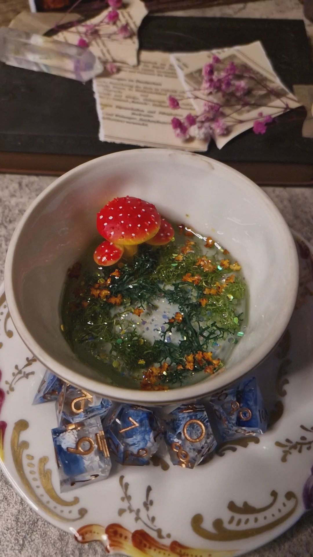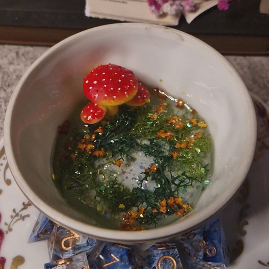 Dieses außergewöhnliche Würfeltray ist mehr als nur ein Aufbewahrungsort – es ist ein kleines Portal in ein verwunschenes Feenreich. Die zarte Vintage-Tasse, liebevoll dekoriert und verziert, birgt in ihrem Inneren eine Miniatur-Waldszene: Moos, funkelnde Details und ein kleines Fliegenpilz-Dreigestirn wie aus einem alten Zauberbuch.