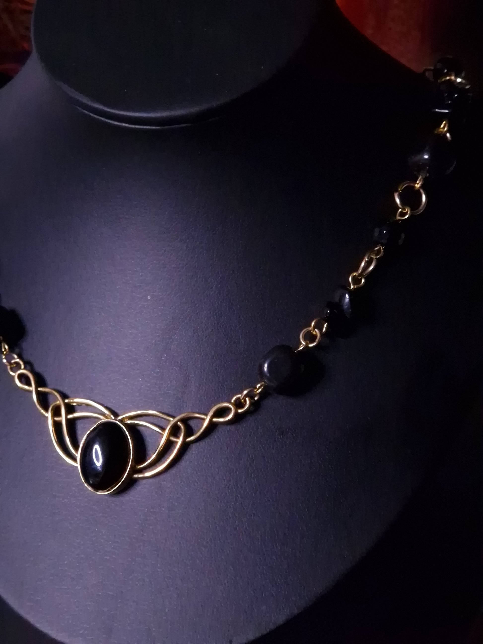 Ein Schmuckstück wie ein Flüstern aus der Nacht – das Collier „Shadow Heart“ vereint die Kraft des schwarzen Obsidians mit der Eleganz goldener Linien. Das keltisch inspirierte Mittelstück umrahmt den tiefschwarzen Stein wie ein Herz aus Schatten und Licht, das Ruhe, Macht und Schutz in sich trägt.
