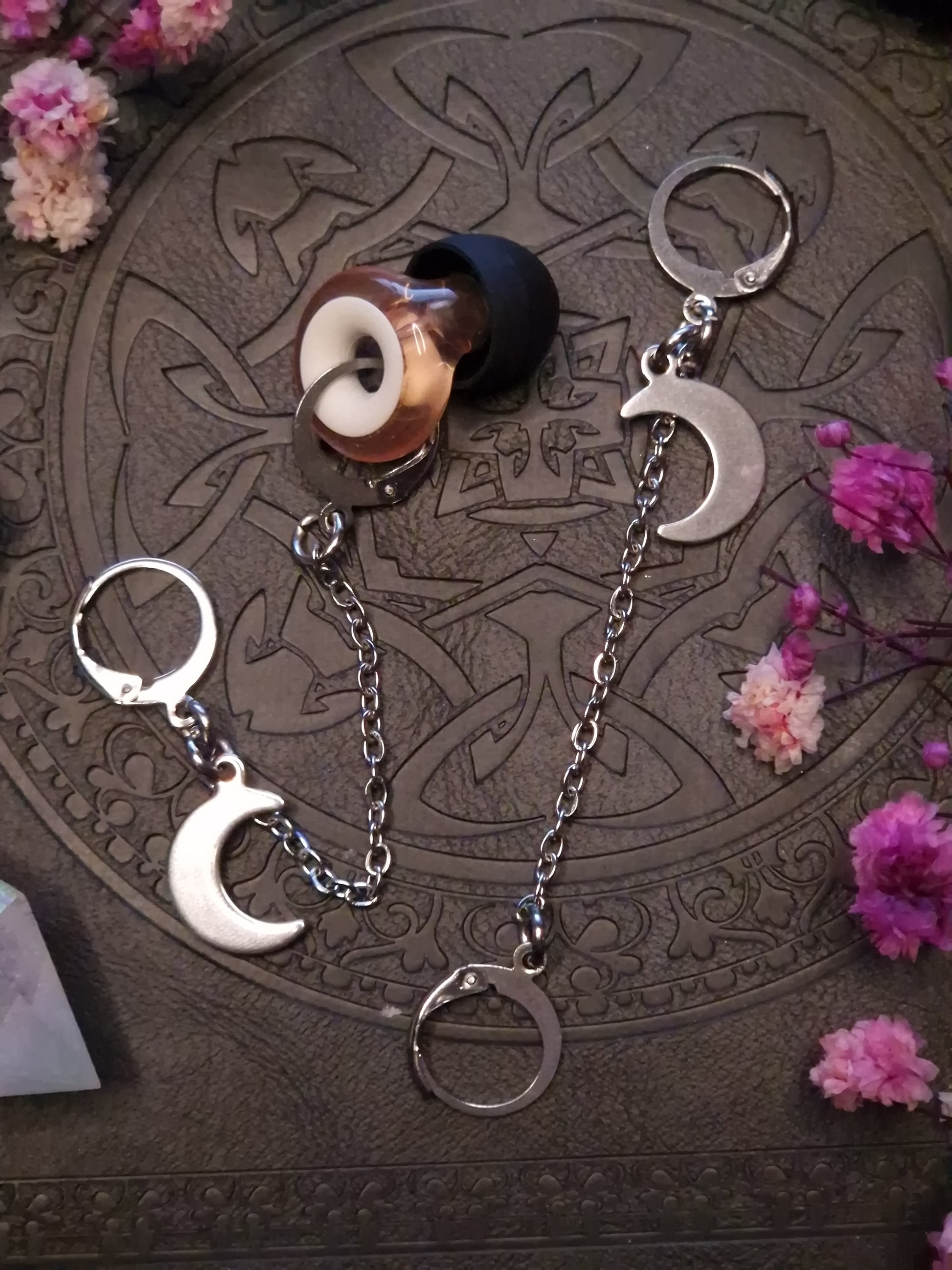 Elegante Creolen, die durch ihre raffinierte Loop-Halterung speziell für Ohrstöpsel ausgelegt sind, versehen mit einem feinen Kettchen und einem funkelnden Halbmond-Anhänger. Die kleine Kette sorgt für ein sanftes, fast schwebendes Tragegefühl, während der Halbmond ein Symbol für Wandel, Intuition und weibliche Stärke ist.