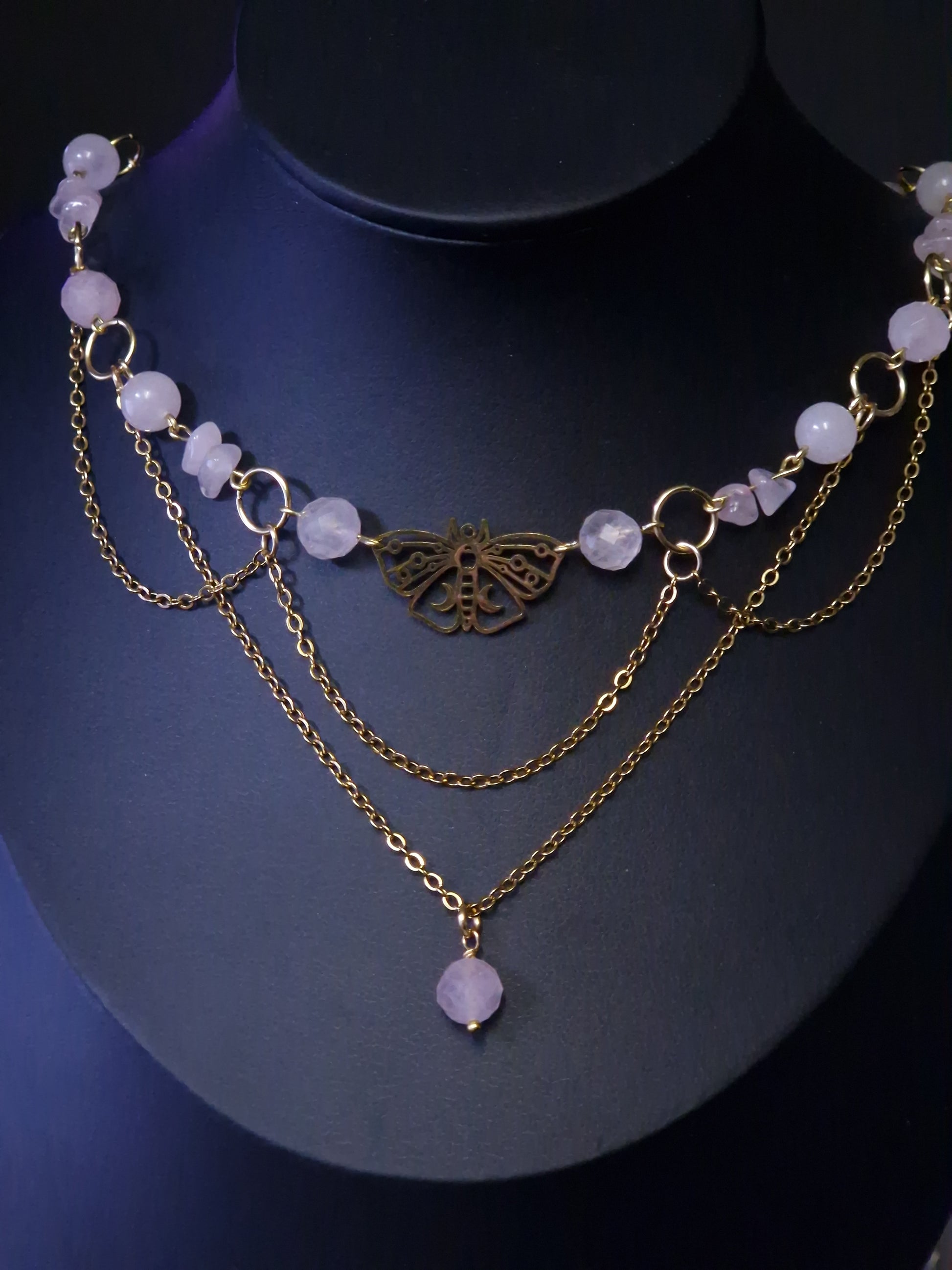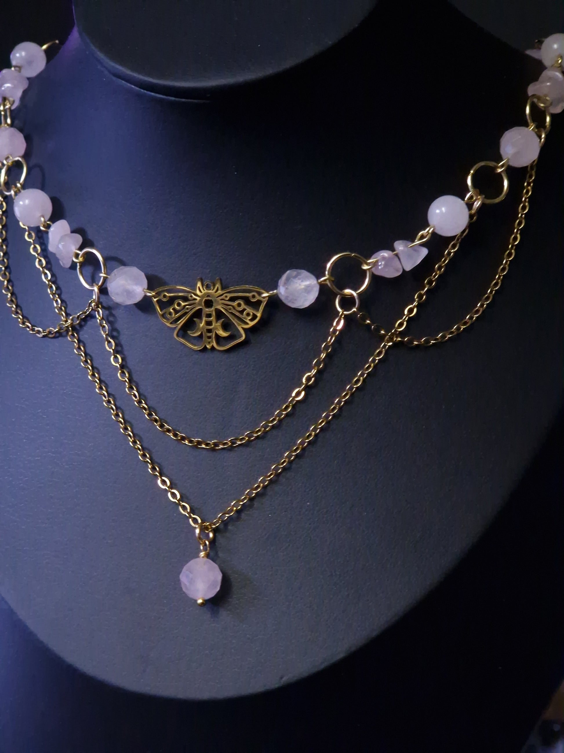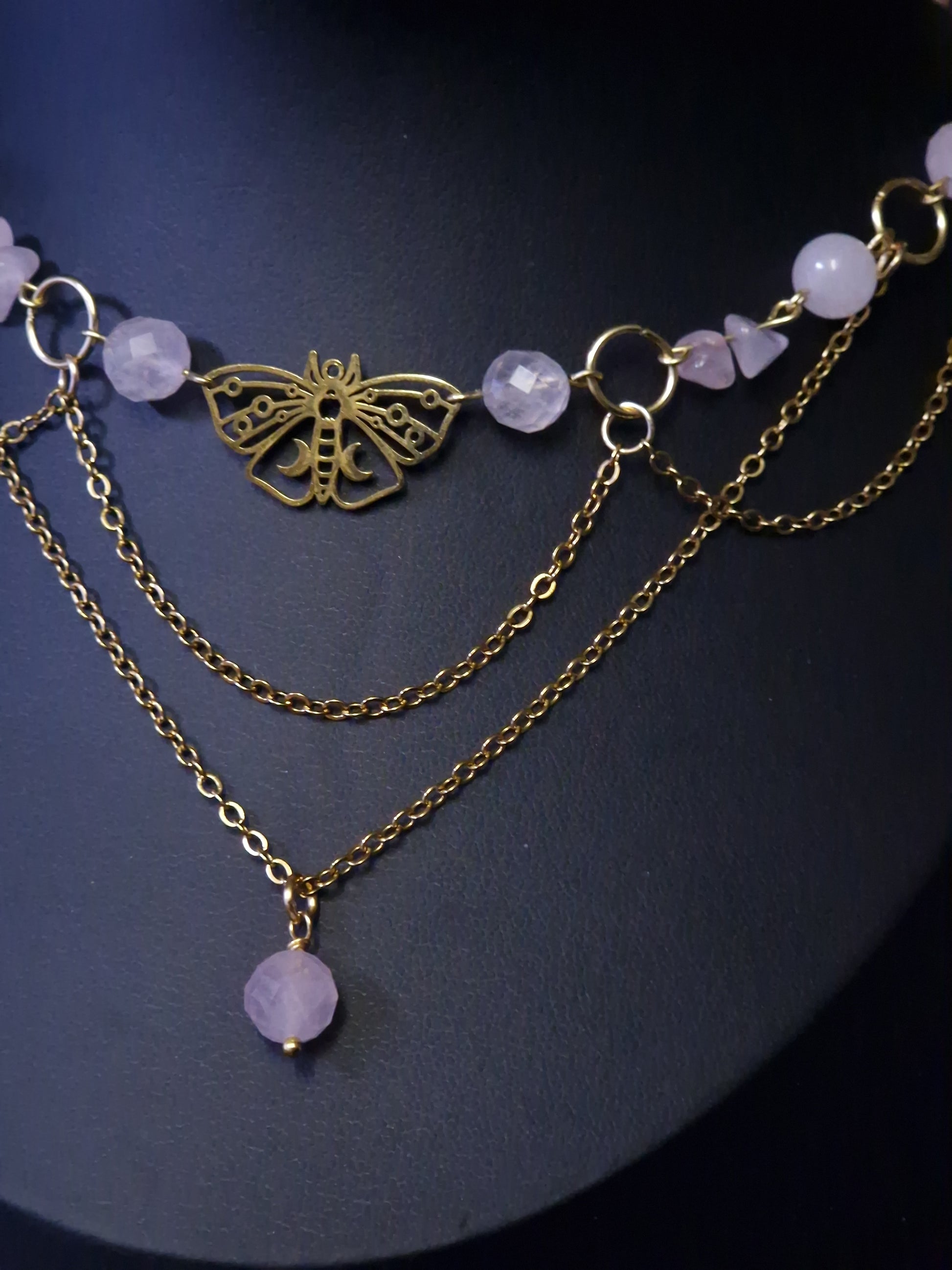 Zart wie ein Flügelschlag in der Dämmerung: Diese bezaubernde Kette kombiniert sanften Rosenquarz mit filigranen Goldakzenten und einer detailreichen Motte als zentrales Element – ein Symbol für Transformation, Intuition und nächtliche Magie.