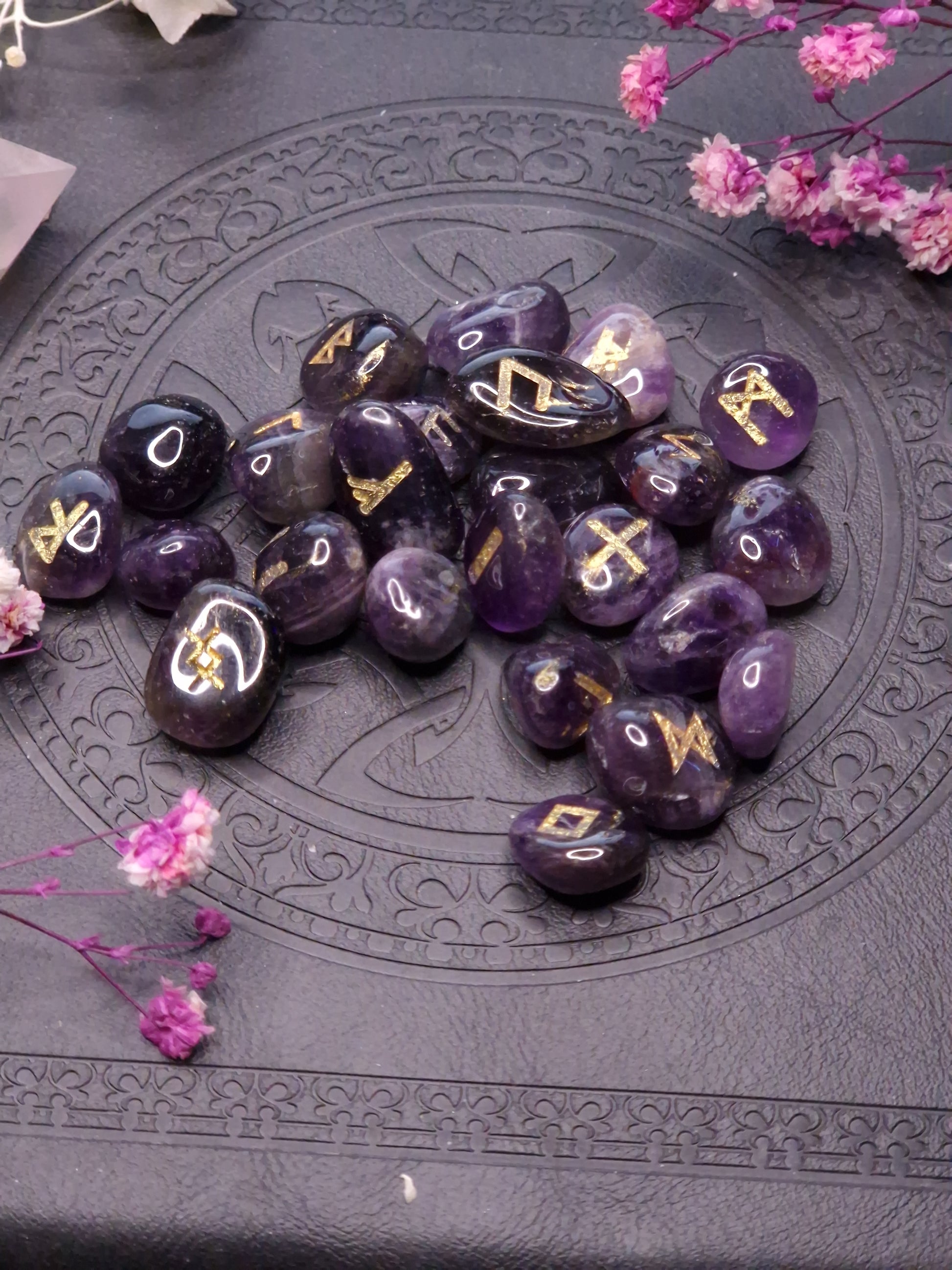 Du erhältst ein Amethyst Elder Futhark Kristall Runenstein Set.