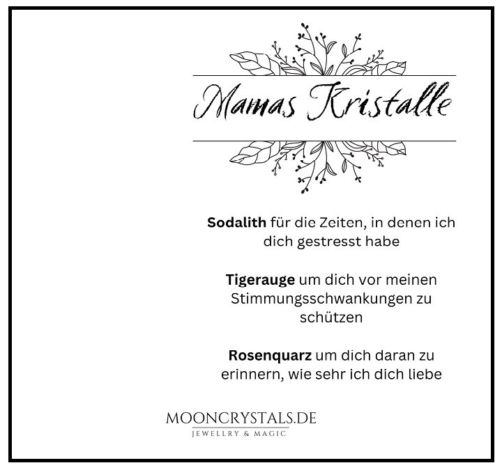 Ein kleiner, aber bedeutungsvoller Talisman – geschaffen, um die Verbindung zwischen Mutter und Kind zu symbolisieren. Jeder Stein trägt eine Botschaft voller Liebe, Geduld und Verständnis – wie ein stilles „Ich bin immer bei dir“.