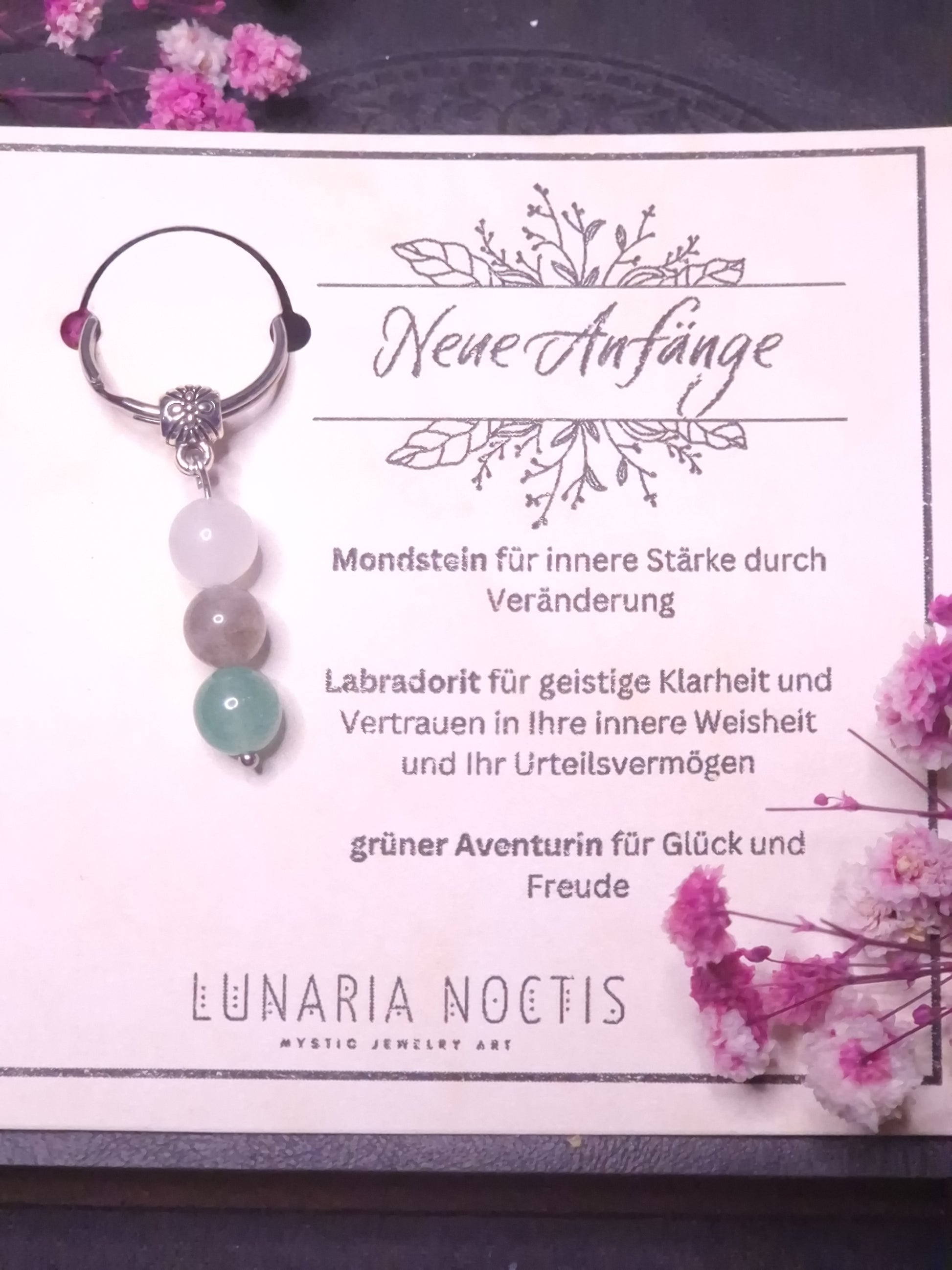Ein zarter Begleiter für alle, die einen neuen Lebensabschnitt beginnen – ob Neuanfang, Umbruch oder inneres Wachstum. Dieser handgefertigte Edelstein-Anhänger erinnert dich daran, dass jeder Schritt nach vorn ein Akt des Vertrauens in dich selbst ist.