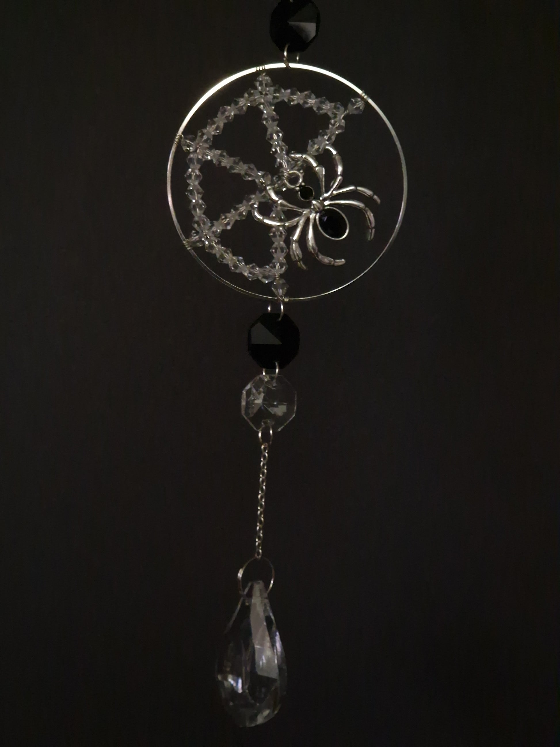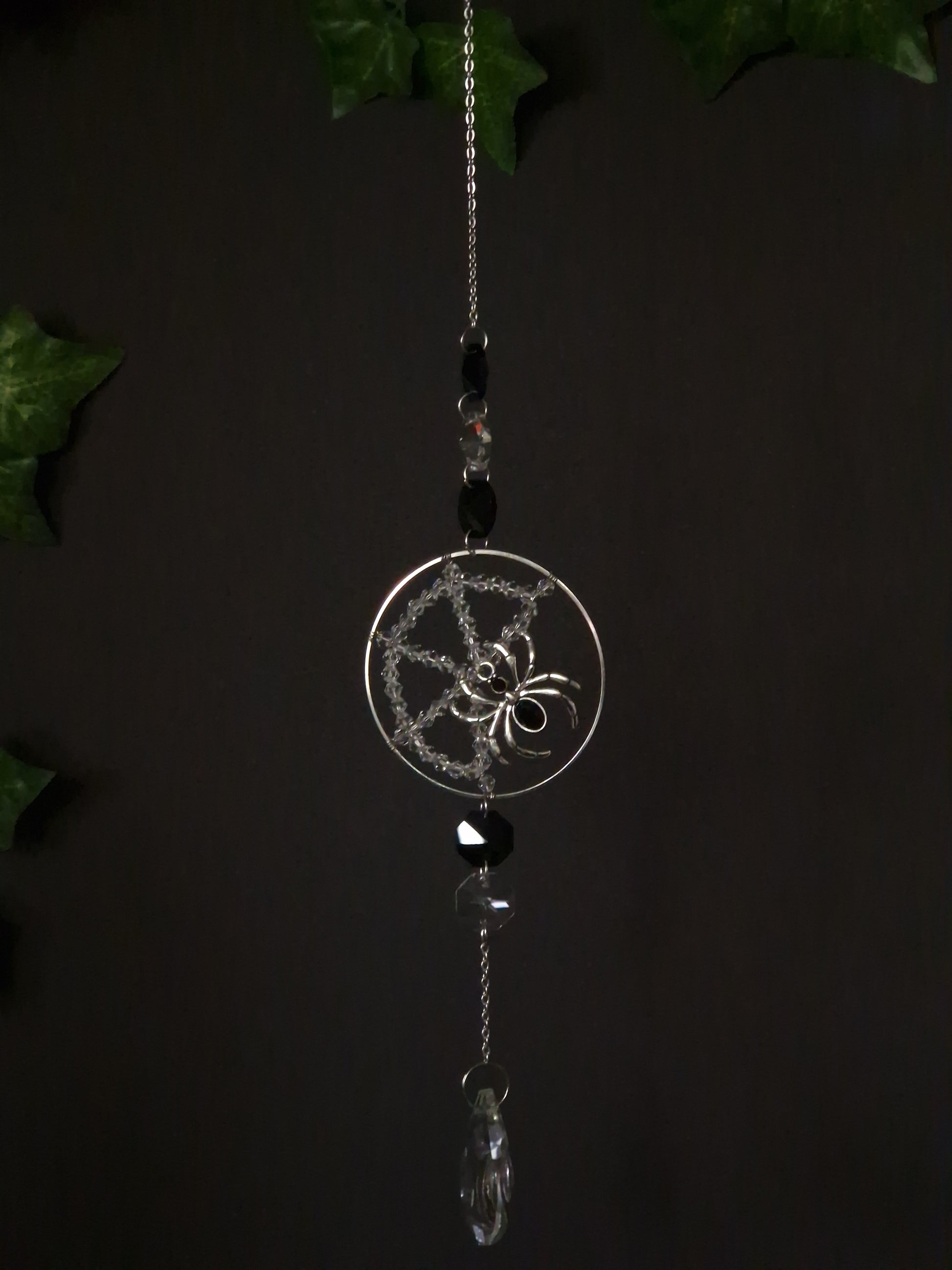 Ein filigranes Netz aus Silber, durchwebt mit schwarzem Kristall und transparenten Prismen – dieser Sonnenfänger fängt das Licht ein und wirft geheimnisvolle Reflexe in deinen Raum. 🕸️