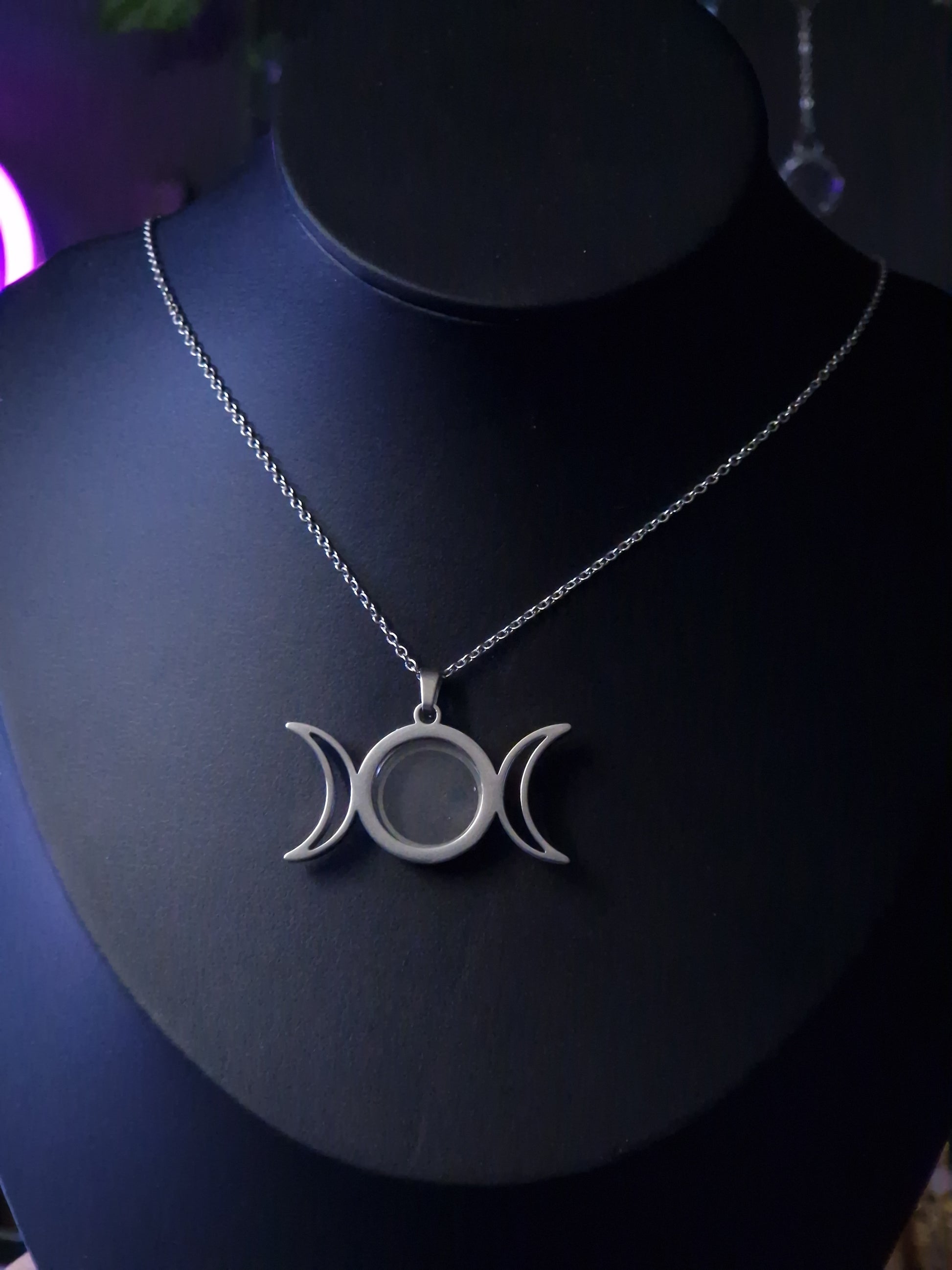 Diese magische Halskette in silbernem Glanz vereint die Kraft des Dreifachmondes – Symbol für die Göttin in ihren drei Aspekten: Jungfrau, Mutter und Weise. Das besondere Highlight: Der mittlere Vollmond lässt sich öffnen und bietet Platz für ein kleines Geheimnis – ein Foto, ein Duftstein oder ein persönlicher Talisman.