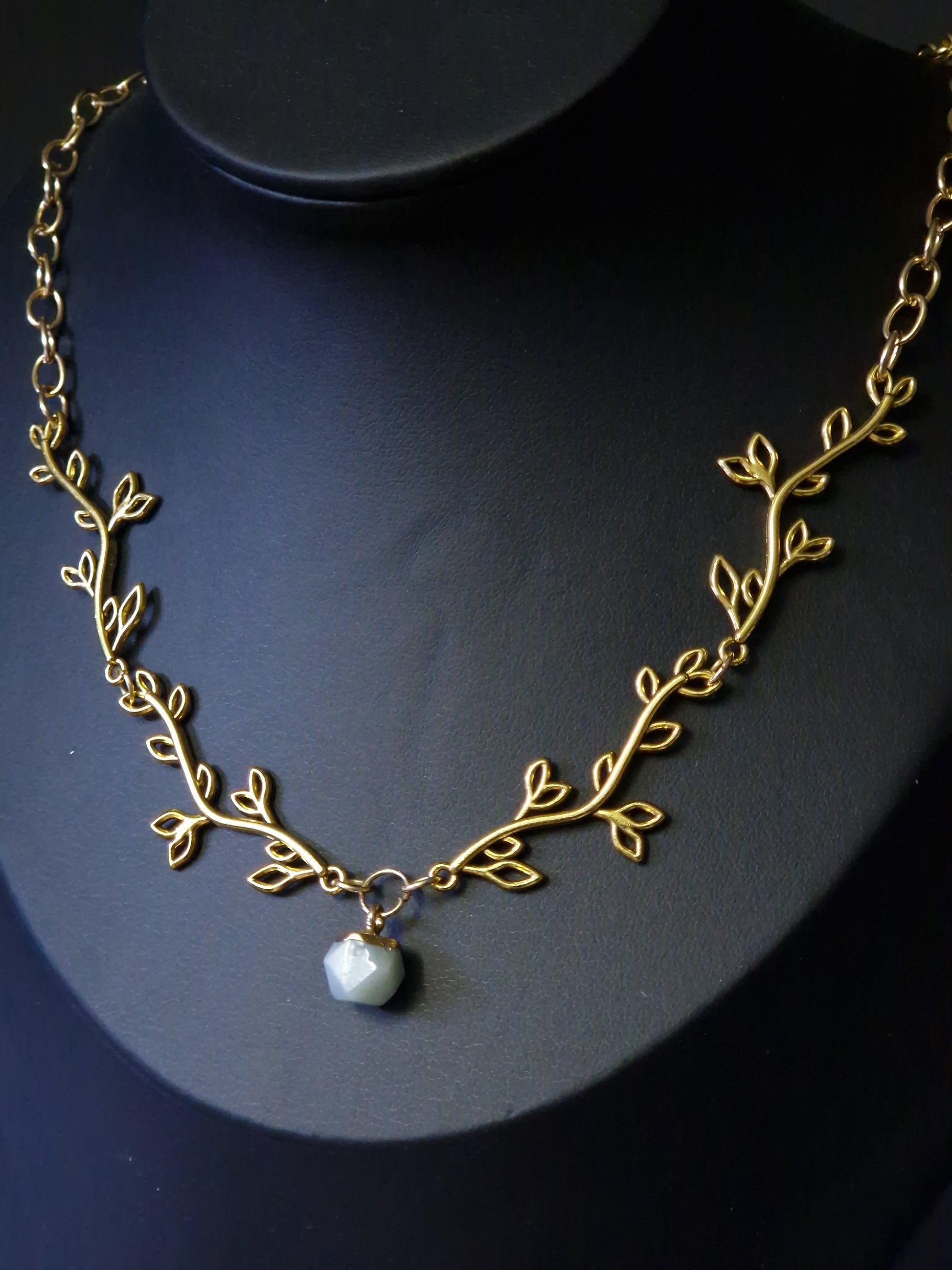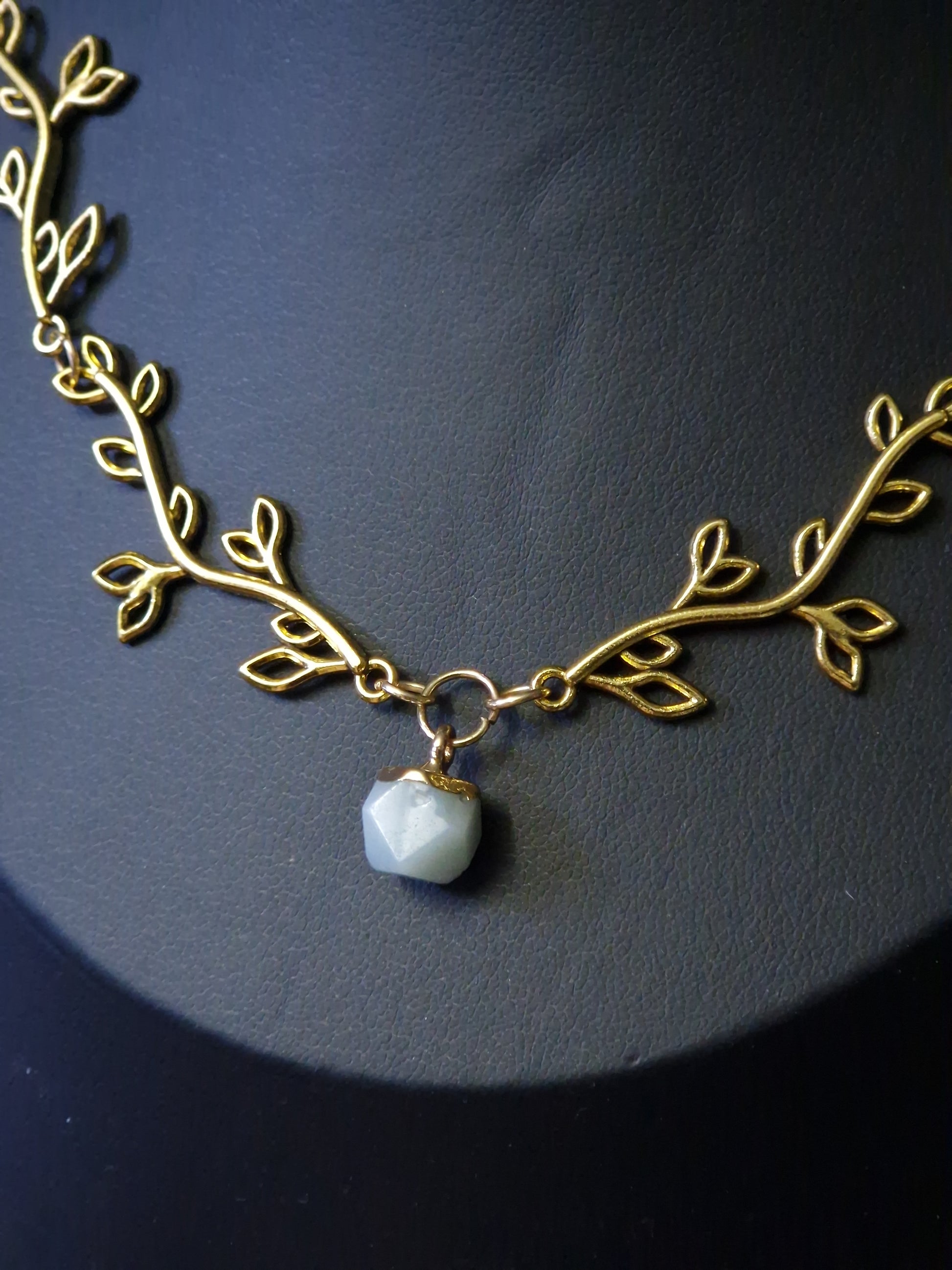 Wie aus einem Feenwald entsprungen, windet sich dieses filigrane Collier in goldenen Ranken um deinen Hals. Ein zarter Zweig aus Metall schmiegt sich an die Haut und trägt in seiner Mitte einen facettierten Edelstein – wahlweise Calzedon, Obsidian oder Amazonit – jeder mit seiner eigenen Magie.